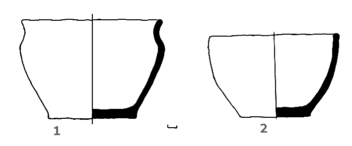 Насип кургану розорювався. На початок розкопок висота насипу становила 0,65 м, діаметр за лінією північ-південь – 26 м, захід-схід – 22 м (рис. 1, 1)2. На рівні стародавнього горизонту, за 8 м на південь від умовного центру, виявлено рештки тризни у вигляді кісток черепа, зубів і ніг коня та двох фрагментів амфори. На відстані 5,9 м на південний схід від центру, на глибині 0,8 м від вершини кургану, знайдено дві посудини зрубної культури — горщик та банку (рис. 2, 1, 2), неподалік — ще кілька фрагментів кераміки того само часу, орнаментованих відбитками зубчастого штампу3. Жодних остеологічних решток поблизу горщиків не зафіксовано, тому питання про характер комплексу бронзової доби, а також його можливий зв’язок із курганним насипом, залишається відкритим.