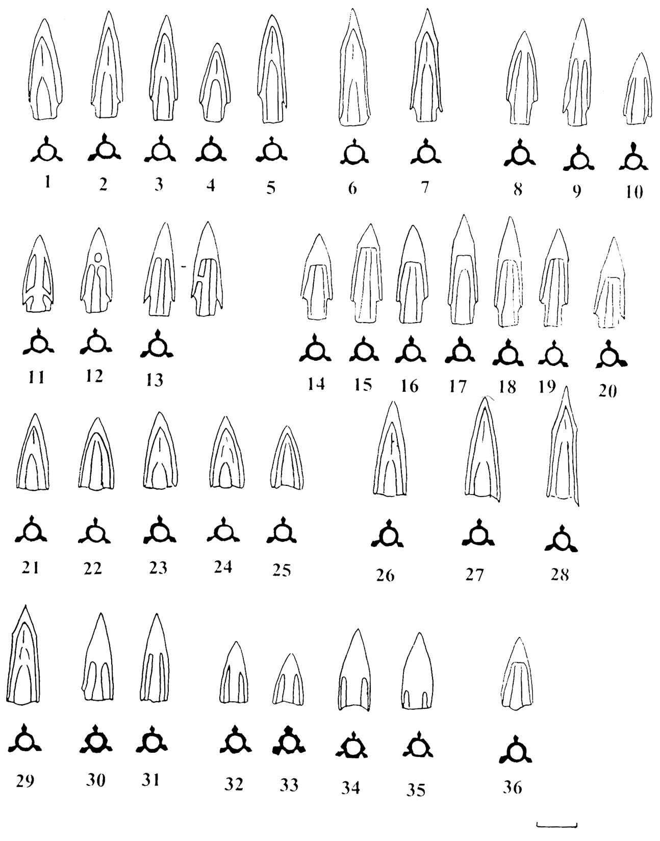 - наконечники аналогічної форми, але із заглибленнями майже до вершини голівки та більш приземкуватих пропорцій; довжина 1,3-1,5 см; 2 екз. (рис. 3, 32, 33);