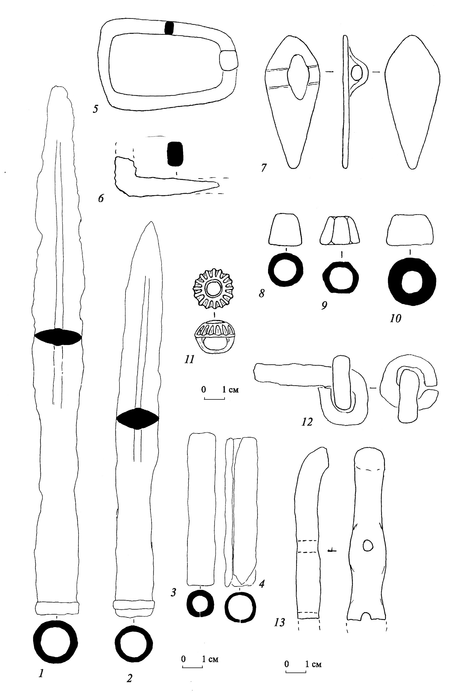 Псалій. Зберігся уламок залізного дводір-частого псалія з малопомітним вісімкоподіб-ним потовщенням посередині. Один кінець стрижня псалія ледь загнутий, форма іншого не відома (рис. 4, 13).