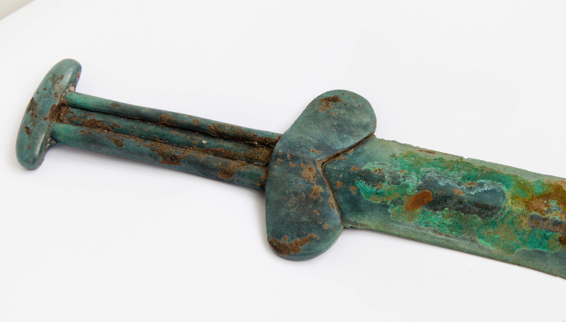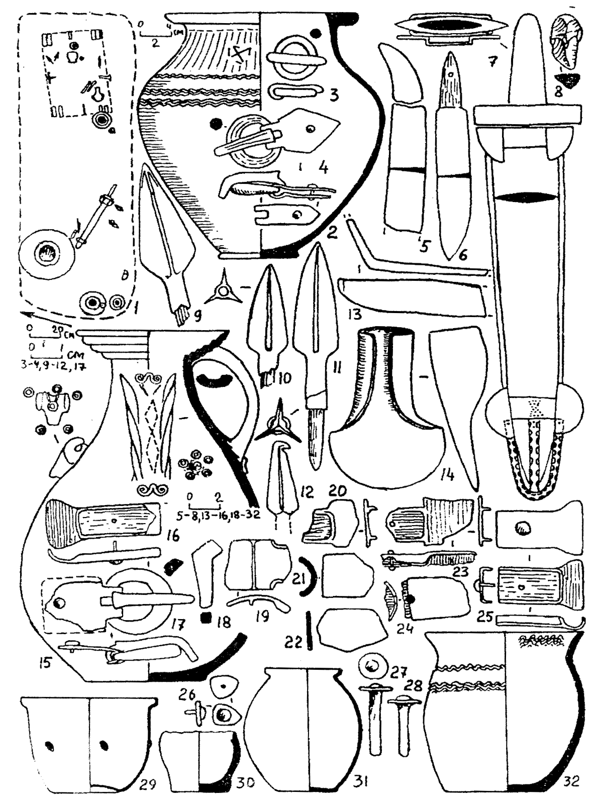 В северокавказских древностях эпохи Великого переселения народов (кон. IV - первая треть VI в.) представлены два вида оружия с коротким клинком (более 25 и менее 65 см) – обоюдоострый кинжал и однолезвийный скрамасакс (боевой нож, тесак). Здесь будет рассмотрено происхождение их престижных образцов. Кинжалы и скрамасаксы встречаются в погребениях как вспомогательное оружие при длинном мече, так и в качестве основного оружия. Больше всего мечей, кинжалов и скрамаксаксов эпохи переселения народов найдено в Западном Предкавказье, в зоне расселения протоадыгских народов, где предметы воинской экипировки тогда сравнительно часто помещались в погребения. В Центральном Предкавказье, в аланской зоне, их меньше, здесь оружие находится преимущественно в привилегированных погребениях. В горной Чечне и Дагестане количество клинкового оружия снова возрастает, что связано, вероятно, с особенностями погребального обряда.