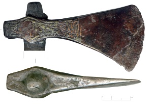 В 2005 году на Пятницком раскопе в Старой Руссе при разборке заполнения сруба ПС-7 был найден боевой топор с хорошо сохранившимся деревянным топорищем (13-14 № 270). Сруб находился в северо-западном углу раскопа, на уровне 12-13 пластов и был отнесён к IV строительному ярусу (общая датировка яруса - 1360-е годы). Постройка эта интересна тем, что, по-видимому, входила в состав комплекса сооружений, связанных с производством соли. Пространство к востоку от сруба, на площади около 8-10 квадратных метров, было покрыто слоем спёкшейся серо-голубой шлаковидной массы – отходов выпаривания соли (т.н. - сидерита). Здесь же, найдено несколько деревянных деталей, вероятно принадлежавших варнице, а также более 200 фрагментов цренов2 и заклепок от них.