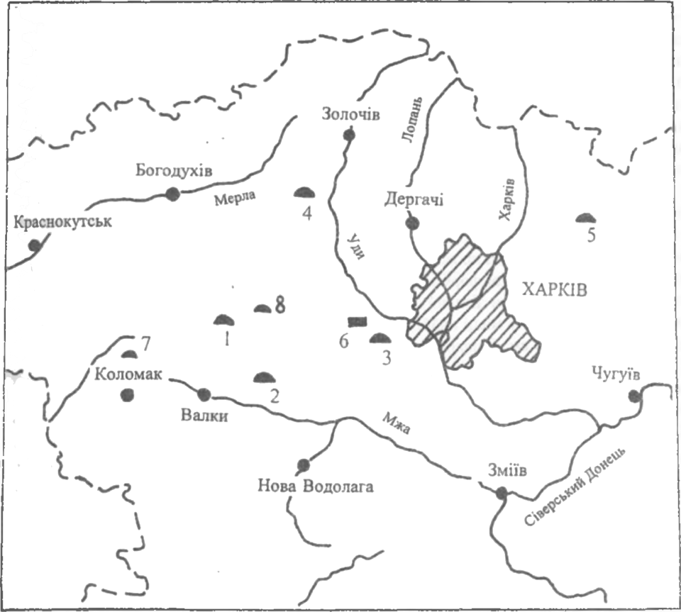 Серед пам’яток скіфської доби сіверськодонецького регіону та донецько-ворсклінського порубіжжя до цього часу було виявлено 5 поховань в катакомбах різного типу (рис.З) «курган-зольник» поблизу с. Черемушна4 [Либеров, 1962, с.82, рис.22], кургани № 2 поблизу с. Новий Мерчик [Шрамко, Бойко, 1988, с. 102, 103, рис.З], № 1 біля с. Рідний Край [Бандуровский, Буйнов, 2000, с.37, 38, рис.47], № 4 поблизу с. Веселе [Шрамко, 1992, с.112-115, рис.1, 1-3] № 28 Пісочинського могильника [Бабенко, 2005, с.31, 46, 47; рис. 35, 3, 4] (рис.4, 1-5). Цей перелік доповнюють ще два поховання у катакомбах, що були досліджені у 2001 році Мерчанською археологічною експедицією Інституту археології НАНУ одне біля с. Покровка Краснокутського району, інше (глибиною понад 5 м!) в одній із груп Старомерчанського могильника5.