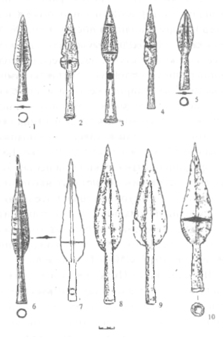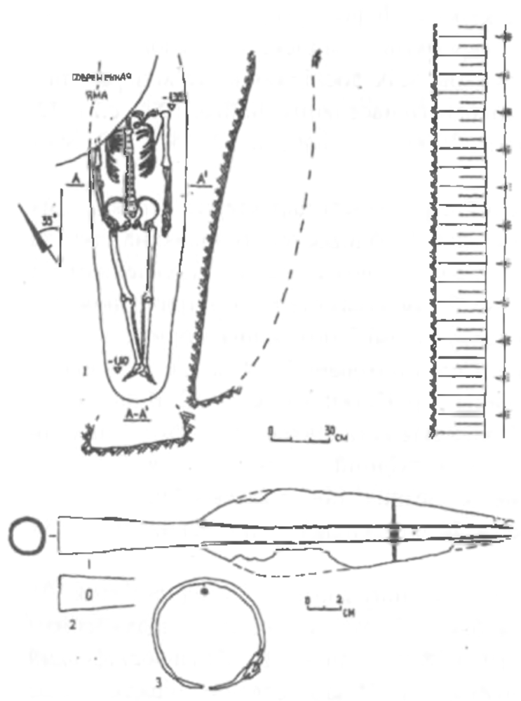 Особливості місцеположення наконечника списа свідчать на користь того, що перед покладенням у могилу ратище списа було зламане поблизу втулки наконечника. Злам ратища списа перед покладенням у могилу мав місце у поховальній практиці населення скіфського часу у тому випадку, коли довжина списа перевищувала розміри могили, що не дозволяло покласти спис цілим [Черненко, 1984, с.232]. Подібне пояснення цілком прийнятне і для нашого випадку, хоча не можна повністю виключити ймовірність зламу списа під час ритуальних дій, пов’язаних з обрядом навмисного псування речей небіж-ника. Досить вказати, що у скіфському поховальному обряді зафіксовані різноманітні випадки застосування ритуальних дій по відношенню до предметів озброєння, та списів зокрема [Бессонова, 1984, с.7-10].