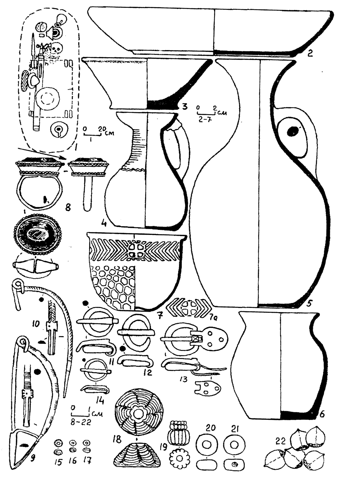 Погребения 57 и 61 могильника Цибилиум-1, относящиеся к концу IV - первой половине V в., содержали, в составе воинской экипировки, кинжалы с четырьмя выступами на ножнах (Рис. 1,7;3,3), предназначенными для его крепления (Воронов, 2003, с.21-23, рис.26,7;28,3). Установлено восточное, возможно, сасанидское, происхождение этого типа кинжалов (из последних работ: Lebedynsky, 1999; Bona, 2002, р. 199; Overlaet, 1989, р.743; Soupault, 2007; Засецкая и др., 2007, с. 139). В данной работе я попытаюсь рассмотреть эти находки в конкретном культурном контексте, а также определить ситуацию, при которой они могли попасть к апсилам.