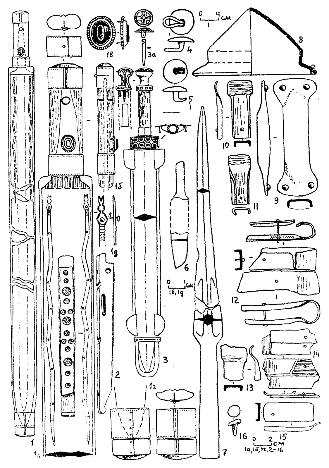 Кинжалы с подобными ножнами хорошо известны на Востоке, как по археологическим находкам, так и по иконографии. Пожалуй, наиболее древние модели кинжалов в ножнах с четырьмя выступами, так называемого ирано-алтайского типа, происходят с Алтая, где они датируются III - II вв. до н.э. (Кубарев, 1981, с.44-47). Более поздние находки в Южной Сибири представлены кинжалами таштыкской культуры, которые относятся ко времени от І по VI вв. н.э. (Вадецкая, 1987, с.69,70, рис.1). Видимо, с какими-то волнами кочевников кинжалы с четырьмя выступами распространяются из Центральной Азии вдоль Великой степи на Запад. При этом образцы таких кинжалов попадают как на Средний Восток, так и в Северное Причерноморье. Так, изображения кинжалов с четырьмя выступами на ножнах появляются на монетах кочевнических правителей Бухарского оазиса (Bespalyi, Perevoztchikov, 1995, р.74). Роскошный «парадный» экземпляр такого кинжала был обнаружен в погр. 4 «царского» некрополя Тилля-Тепе, в Северном Афганистане, дата погребения - I в. н.э. (Сарианиди, 1989, рис.3,3; Afghanistan, les tresors retrouves, 2007, cat.№113). Возможно, некрополь связан с кочевниками юэджи-кушанами, продвинувшимися сюда из Центральной Азии.