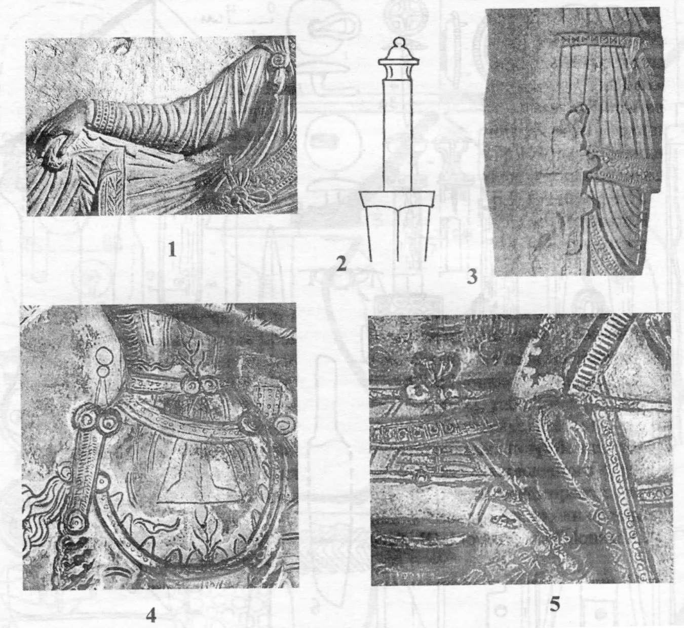 Еще одна деталь указывает на восточное, скорее всего иранское, происхождение цебельдин-ских находок - это полусферическое, с перехватом в месте его соединения с рукоятью, навер-шие кинжала из погребения 61 могильника Цибилиум-1 (рис.3,3). Такие навершия характерны именно для восточных мечей, предположительно, иранского происхождения (Bona, 2002, fig.5,12,104,113, р. 199; Засецкая и др., 2007, с.139). Наиболее близки навершия «иранских» мечей из Тугозвонова в Южной Сибири и погребения 1896 г. в Керчи, могильника Глинище (Bona, 2002, fig.5,114). Их прототипы известны на Ближнем Востоке, в частности в Пальмире, в 229 г. (Рис.4,2: Seyrig, 1937, р.27, fig.18; Kazanski, 1991, fig.3,9).