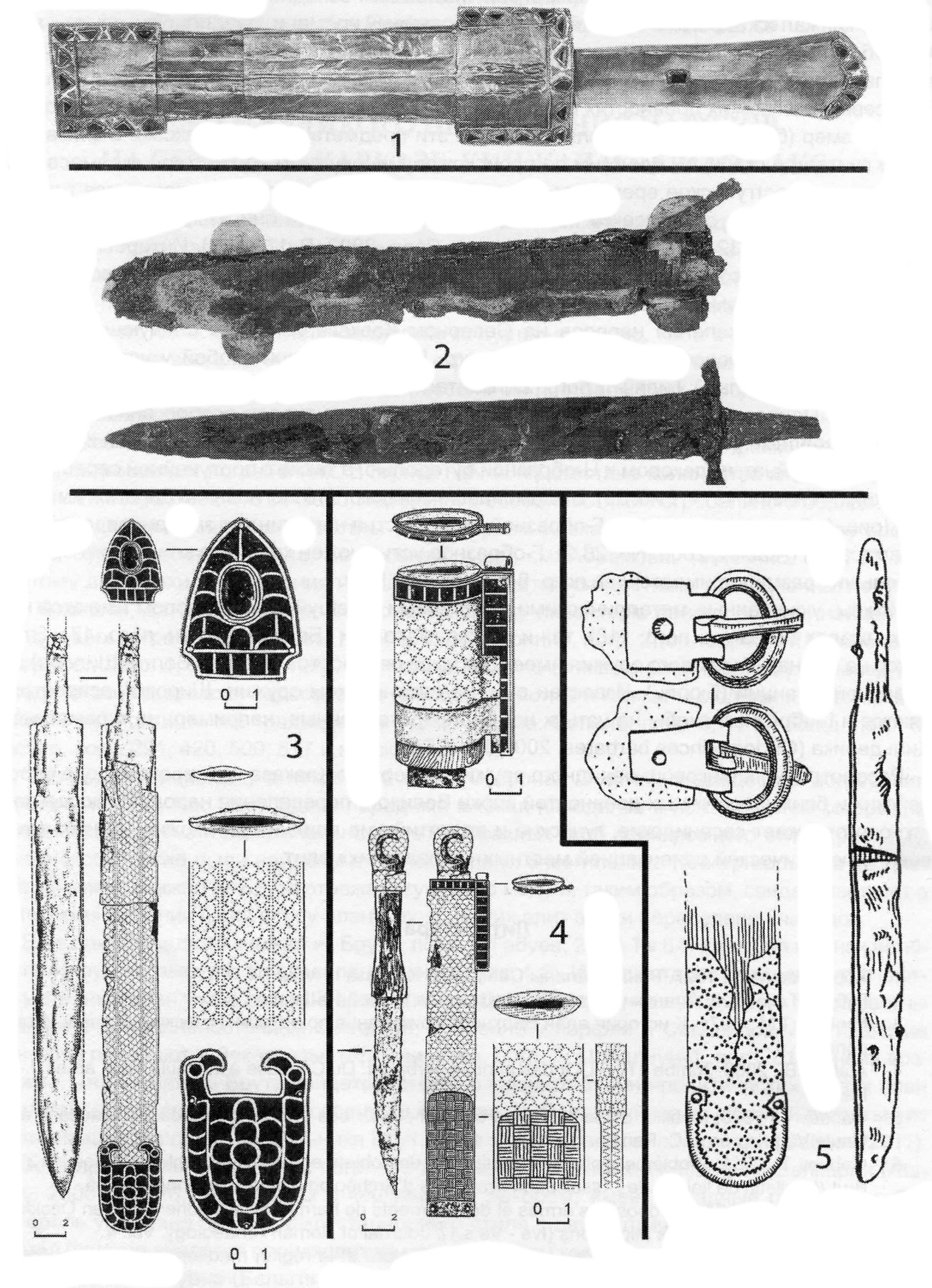 В северокавказских древностях эпохи Великого переселения народов (кон. IV - первая треть VI в.) представлены два вида оружия с коротким клинком (более 25 и менее 65 см) – обоюдоострый кинжал и однолезвийный скрамасакс (боевой нож, тесак). Здесь будет рассмотрено происхождение их престижных образцов. Кинжалы и скрамасаксы встречаются в погребениях как вспомогательное оружие при длинном мече, так и в качестве основного оружия. Больше всего мечей, кинжалов и скрамаксаксов эпохи переселения народов найдено в Западном Предкавказье, в зоне расселения протоадыгских народов, где предметы воинской экипировки тогда сравнительно часто помещались в погребения. В Центральном Предкавказье, в аланской зоне, их меньше, здесь оружие находится преимущественно в привилегированных погребениях. В горной Чечне и Дагестане количество клинкового оружия снова возрастает, что связано, вероятно, с особенностями погребального обряда.