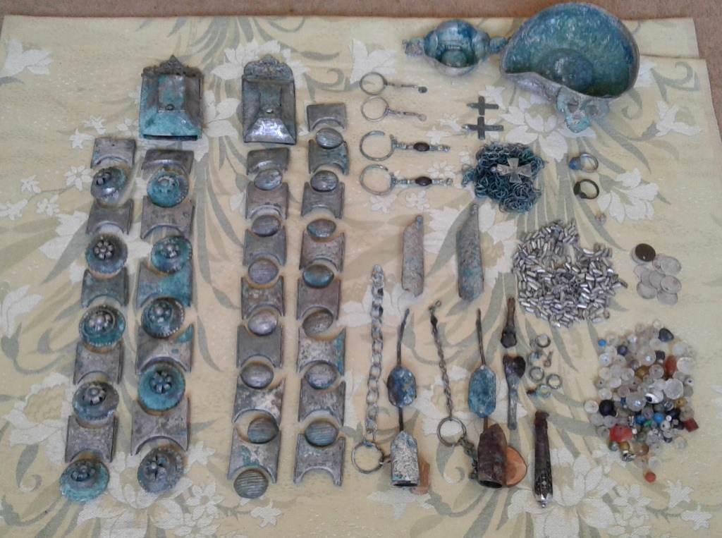 Серьезный клад изделий из серебра был найден искателем buty686, представлен на форуме Виолитиhttp://forum.violity.com/viewtopic.php?t=1685985. Сам комплекс, в силу своего богатства и разнообразности, очень интересен («пшерворские» пояса, только чего стоят), но не менее интересно его обсуждение, конспект, которого представлен здесь. В низу ссылки на форум, где представлены фотографии подобных кладов.Описание: Общий вес комплекса (серебро) – 1200 гр.
