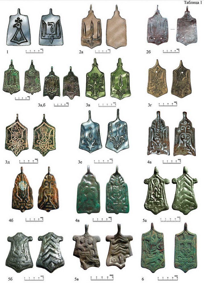 Древнерусские трапециевидные привески с «тризубм»Первые находки трапециевидных привесок с «трезубом» относятся к последнему тридцатилетию XIX в. и вот уже на протяжении более чем ста лет ученые спорят о том, что олицетворяют изображенные на них символы. Большинство исследователей отмечают схожесть композиций со знаками на княжеских сребряниках XI в., из чего делают выводы о принадлежности изделий особо уполномоченным князей. Данная версия имеет ряд слабых сторон, главными из которых являются следующие. Во-первых, существует много других предметов со сходной символикой и нахождение ее на них с этой точки зрения не всегда объяснимо, учитывая то, что часть их происходит со скандинавских территорий и имеет единовременные, а порой и более ранние датировки, нежели вышеуказанные монеты. В качестве яркого примера этого могут служить найденные в Швеции элементы поясного и сумочного наборов X в., о которых указывает в своей работе С.С. Ширинский (12). Во-вторых, существует большая группа орнаментированных подобным образом привесок из захоронений ливов, идущих в комплексе с наборами амулетов (См. рисунок-застаку). Данный факт ставит под сомнение гипотезу о подражании княжеского символа, предполагая сакральный, магический смысл изображений.