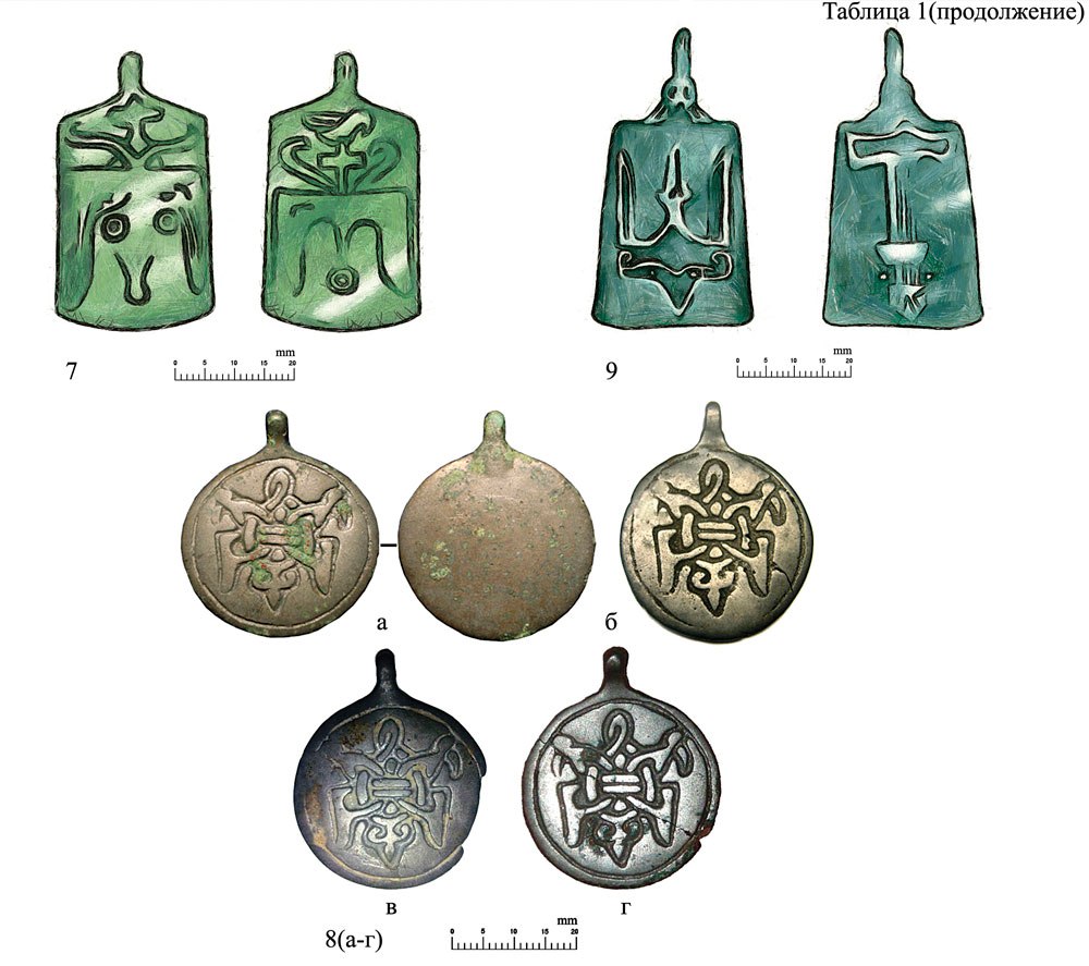 Обращаясь к вопросу семантики обсуждаемых предметов нельзя обойти вниманием уникальную находку из Рождественского могильника в Прикамье (3). Это серебряная литая трапециевидная привеска, на лицевой стороне которой изображена композиция в виде «трезуба», а на оборотной – изображение молота Тора рукоятью вниз (Табл. 1, 9).