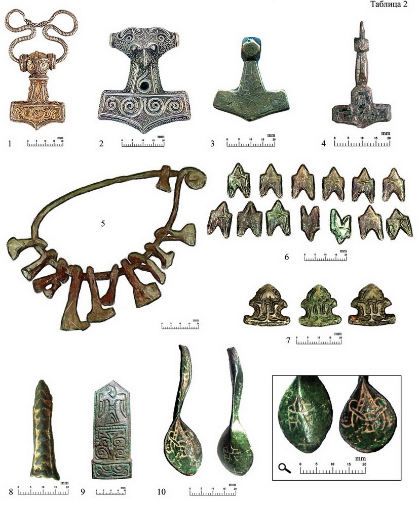 Привески, которые у исследователей принято называть «молотами Тора», были широко распространены в Скандинавии в X – начале XI в. Для филигранно-зерненых представителей этого типа оберегов (Табл. 2, 1, 2) характерно исполнение оглавия в виде головы птицы с большими глазами, а нижнюю часть украшают завитковые композиции, напоминающие клубок змей. На одном из черневых экземпляров привески (Табл. 2, 3) образ змея виден явно. Таким образом, в орнаментации «молотов Тора» присутствуют все три, причем, явно выраженные части, характерные для Мирового Древа (орел, ствол и змеи) и, возможно, посредством изображения одного из них на привеске эта смысловая нагрузка передавалась на нее.
