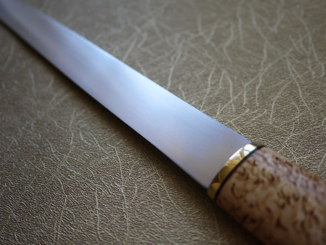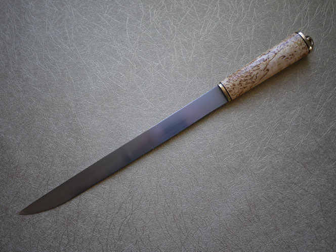 Рукоять - покрытие из кудрявой березы с латунными тыльником и кольцом для темляка.