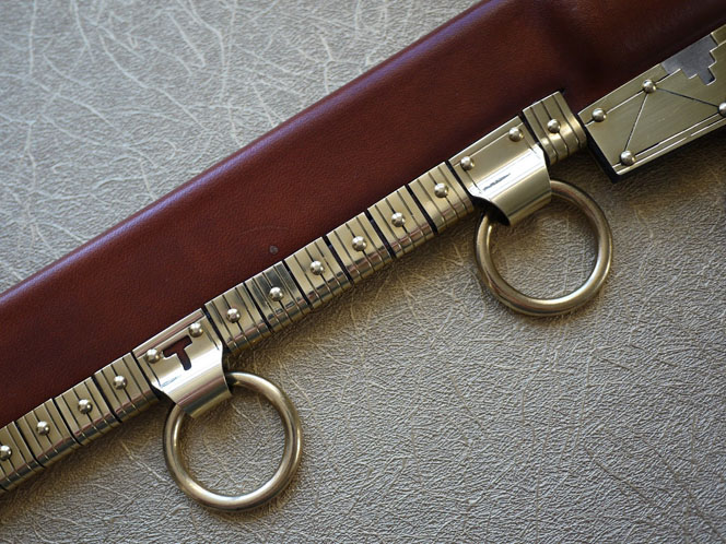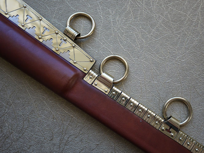 Ножны из толстой дубленной кожи с латунными креплениями и латунными заклепками. Ступенчатые оправки установлены на верхнем креплении с луженой бронзовой подложкой. Три точки подвеса, как в оригинале. Клинок боевого ножа выполнил, из стали O2, очень талантливый мастер Джордж Эцелл. Сам скрамасакс, при ношении, почти полностью, то есть вместе с рукоятью погружен в ножны, так что снаружи виден только тыльник рукояти боевого ножа.