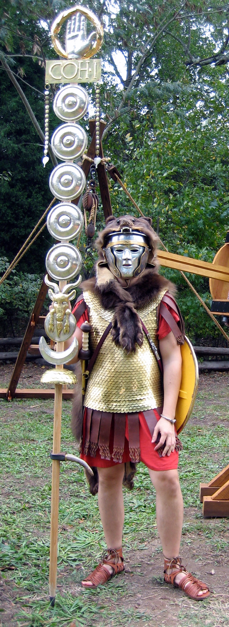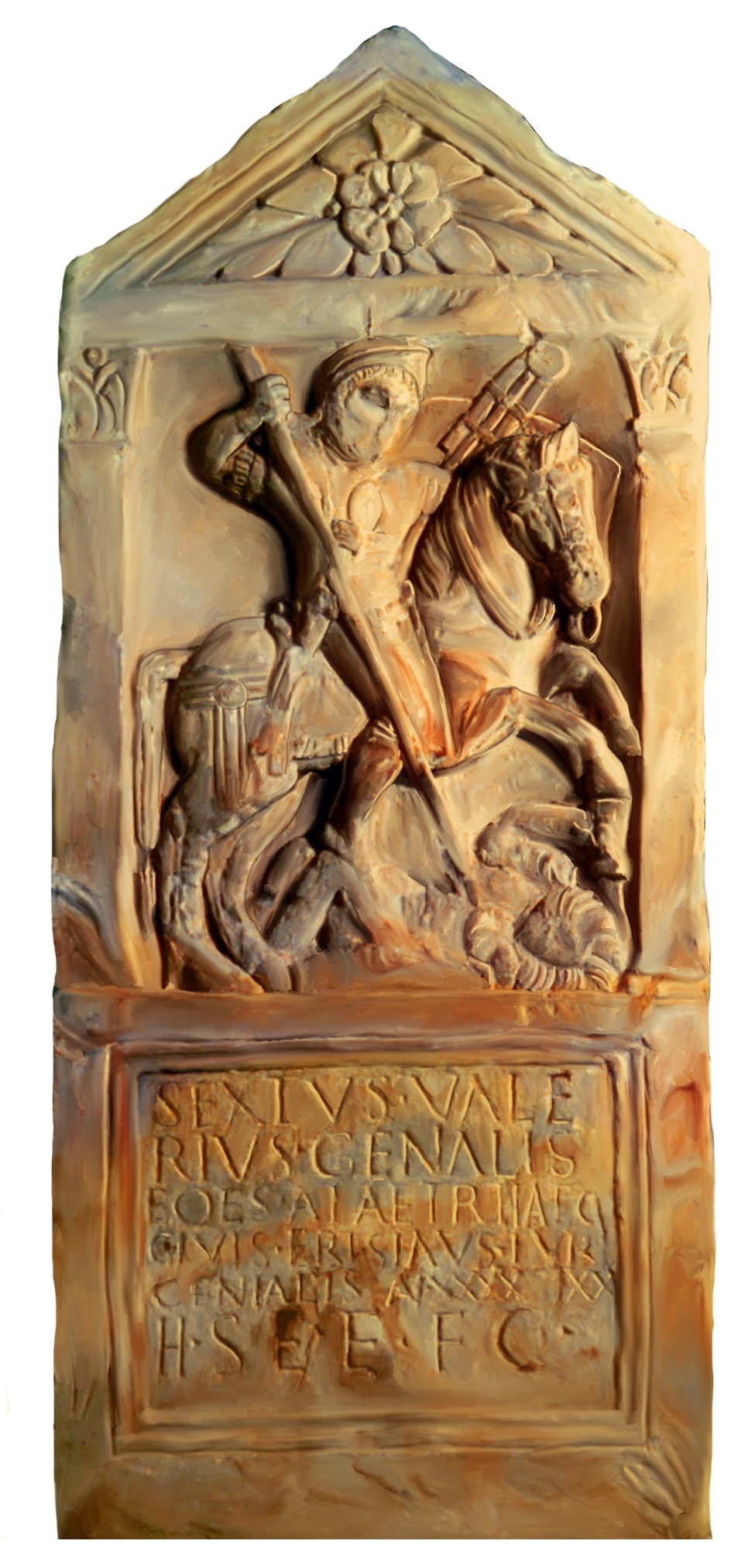 Экспериментальная реконструкция облика римского сигнифера по надгробию Квинта Лукция Фавста Надгробие Секста Валерия Гениалиса из Ala I Thracum. Вторая половина I в. н.э. Киренчестер.