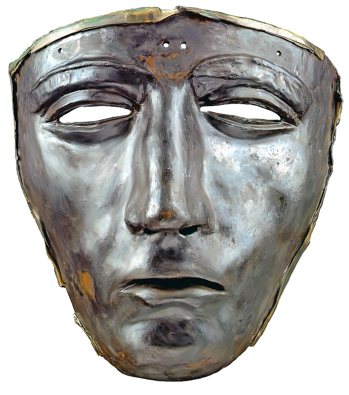 11. Маска была найдена вместе со шлемом в захоронении на территории современной Болгарии. Маска относится к типу Калькризе, шлем—к типу Вайзенау. И маска, и шлем выкованы из сплава меди (бронза или латунь). Толщина металла маски и нащечников — ок. 1 мм, толщина металла шлема — ок. 2 мм. В настоящее время шлем с маской находятся в коллекции Леона Леви и Шелби Уайт в Метрополитанском музее искусств Нью-Йорка, инв. No. 686. См.: [27, S. 54–55, О 88; 33, S. 19–21].