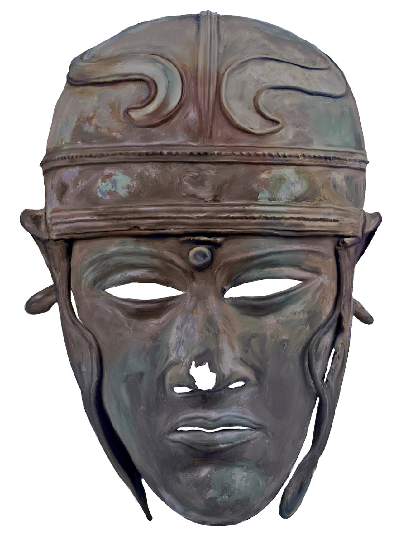 Говоря о возможном использовании церемониальных масок в боевых условиях, следует отметить, что одна из них найдена непосредственно на поле боя у Калькризе (рис. 4) [22, S. 71–92]. С другой стороны, невозможно доказать факт ношения маски непосредственно в момент схватки, и вполне допустимо, что маска находилась в разграбленном обозе. Наиболее впечатляющим подтверждением возможности использования масок в бою являются характерные повреждения, имеющиеся на некоторых из них. На маске из Майнца слева имеется прорубленный след от удара оружием [23, S. 64, O 9, Taf. 18, 3]. Подобным образом повреждена так-же и маска из Торсберга [23, S. 73, O 57, Taf. 25, 4]. На обоих этих экземплярах мы имеем дело именно с рублеными отметинами, что исключает возможность их повреждения на кавалерийском турнире, где, как известно из сообщения Арриана, из оружия применялись только дротики с затупленными наконечниками (Arr. Tact. 34.8).