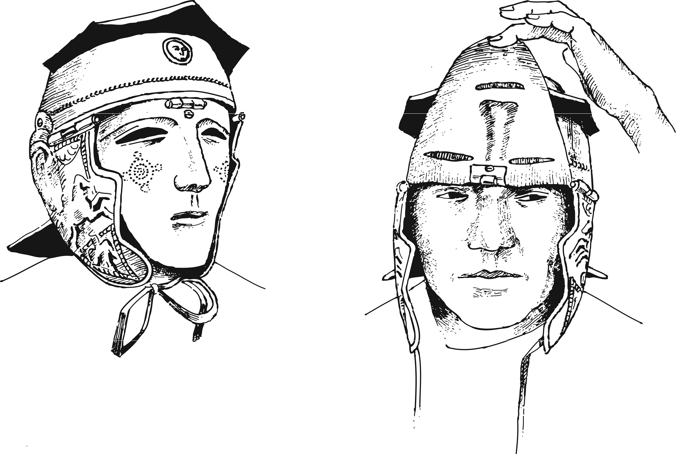 Реконструкция маски типа Калькризе была испытана при ношении в пешем строю10. Данная маска (рис. 5-6) является экспериментальной реконструкцией оригинала первой половины I в. н.э.11 Маски-забрала такого типа крепились к центру нижней кромки лобной части купола шлема с помощью шарнирного соединения. Дополнительно они прочно фиксировались на лице нащечниками шлема, которые, в свою очередь, связывались кожаными шнурками для закрепления шлема на голове воина12. Оригиналы масок данного типа не имели приспособлений для дополнительных креплений. Как показал опыт ношения реконструкции маски, они и не требуются. Следует заметить, что такой метод крепления маски к обычному пехотному шлему позволяет в случае необходимости разобрать соединение без особых усилий и носить шлем без маски (рис. 7).