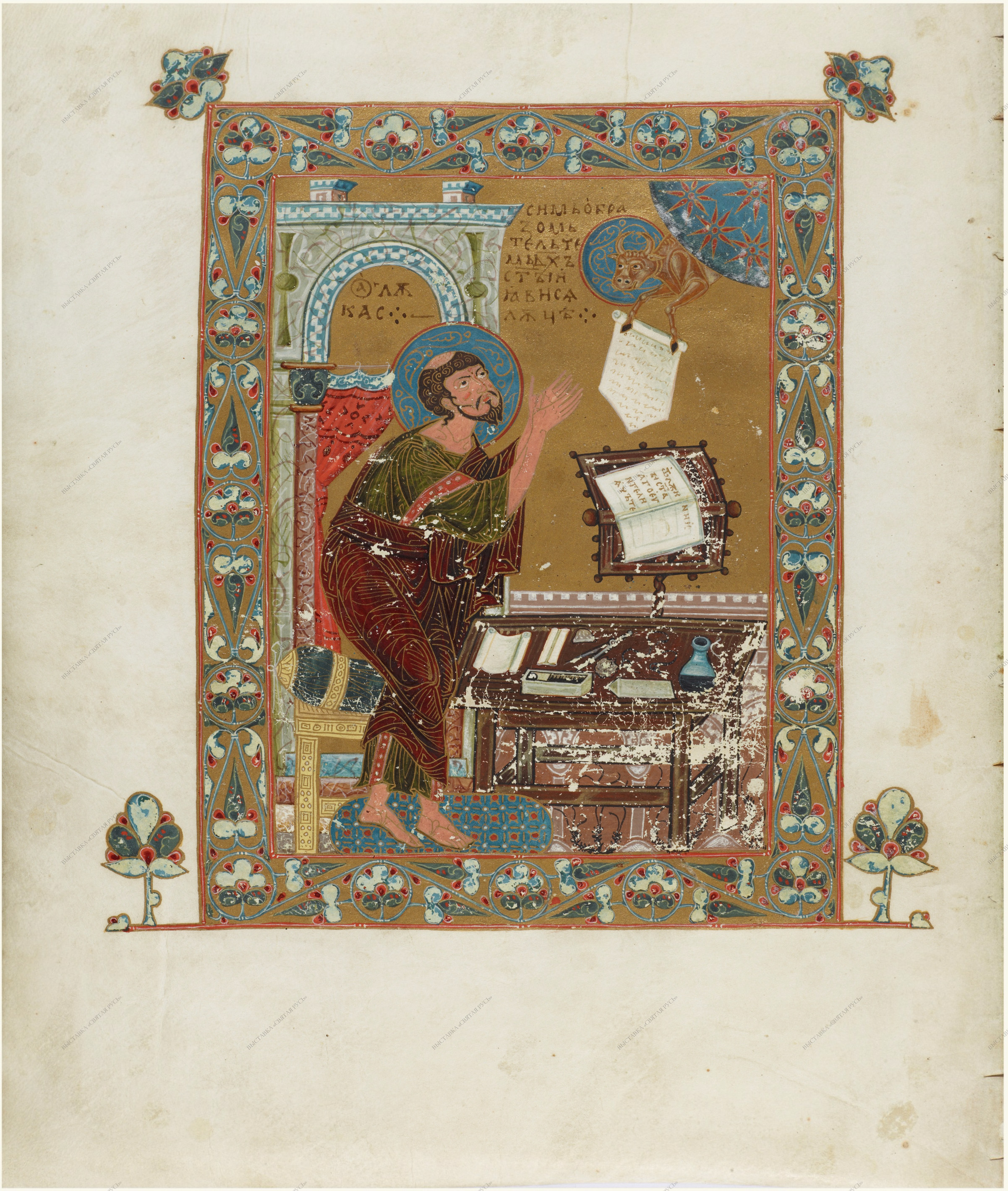 Писец Федор. Киев, Новгород (?) 231 л. Пергамен; чернила, киноварь; переплет – дерево, бархат, серебро; гравировка, литье 33,2 x 28 x 8,8 Поступило в 1920 году в составе Синодальной патриаршей библиотеки На л. 231 об. запись писца: Аз грешьныи Феодор напсах евангелие се рукою грешною святому мученику Георгиеви в манастырь Новугороду при Курияце игумене и Савве икономе. Угриньцъ псаль Происходит из Юрьева монастыря в Великом Новгороде Реставрировано в 1997 году в ГИМ Т.А. Забелиной и Т.А. Авдусиной ГИМ инв. 80370, ОР Син. 1003
