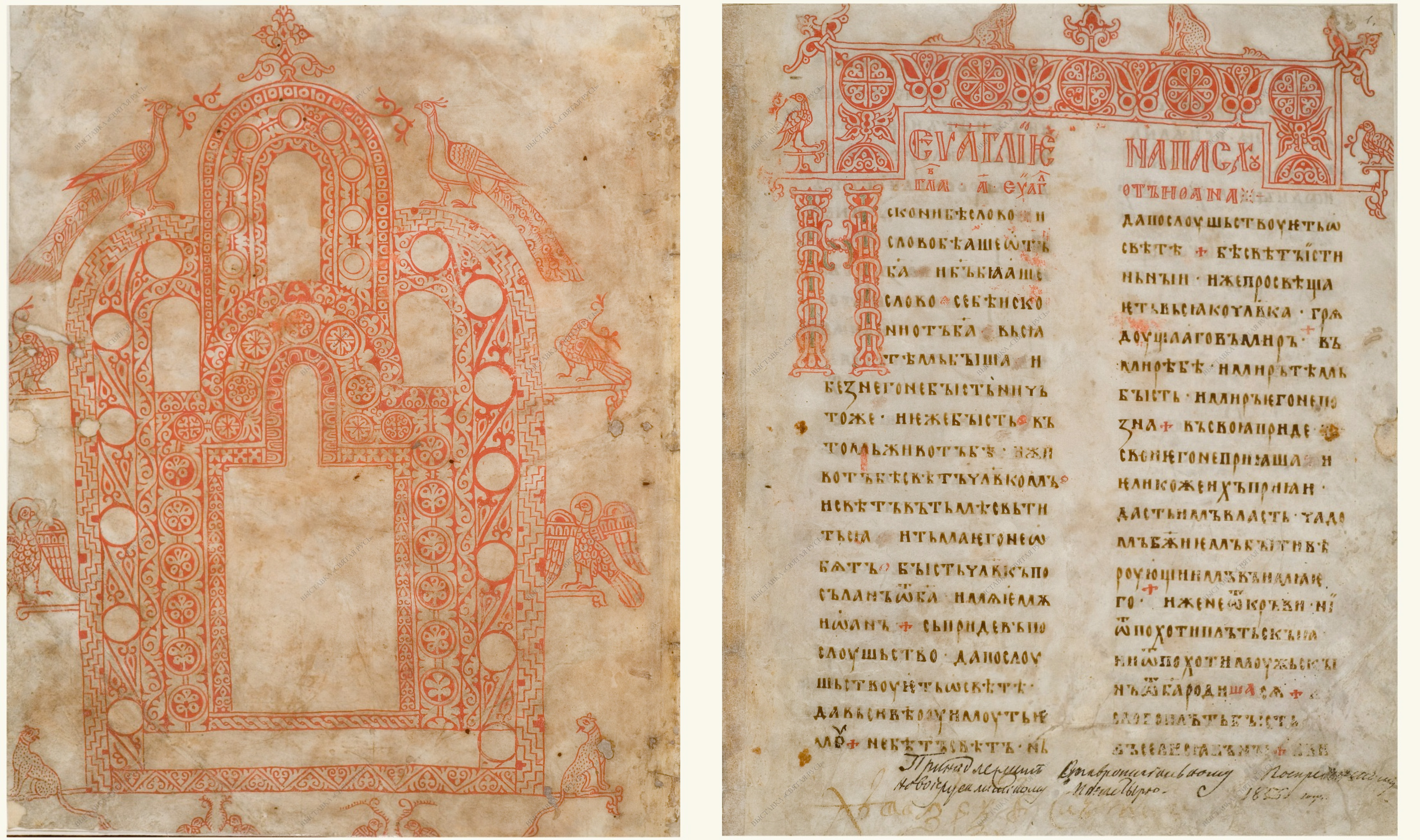 Один из писцов – диакон Григорий. Киев или Новгород 294 л. Пергамент; чернила, киноварь, краски, золото 35,5 x 29,0 Поступило в 1806 году от императора Александра I Происходит из Софийского собора в Великом Новгороде. В 1701 году находилось в Москве, в Воскресенской церкви Московского Кремля; в 1720 – было перевезено в Петербург, а в 1805 – обнаружено Я.А. Дружининым, личным секретарем Екатерины II, среди имущества покойной императрицы Реставрировано в 1955 году Е.Х. Трей; хранится в расплетенном виде РНБ инв. F.п.I.5