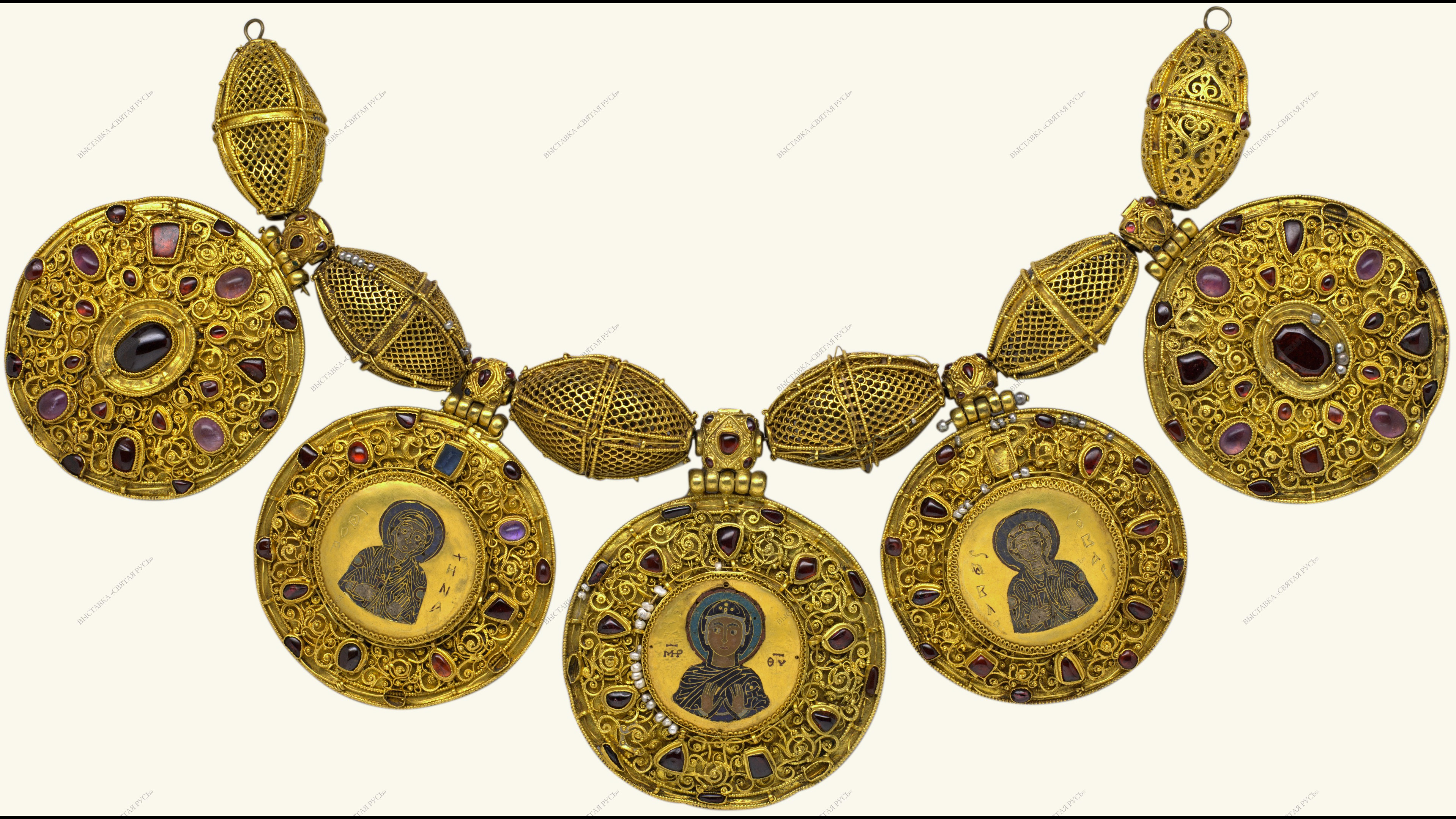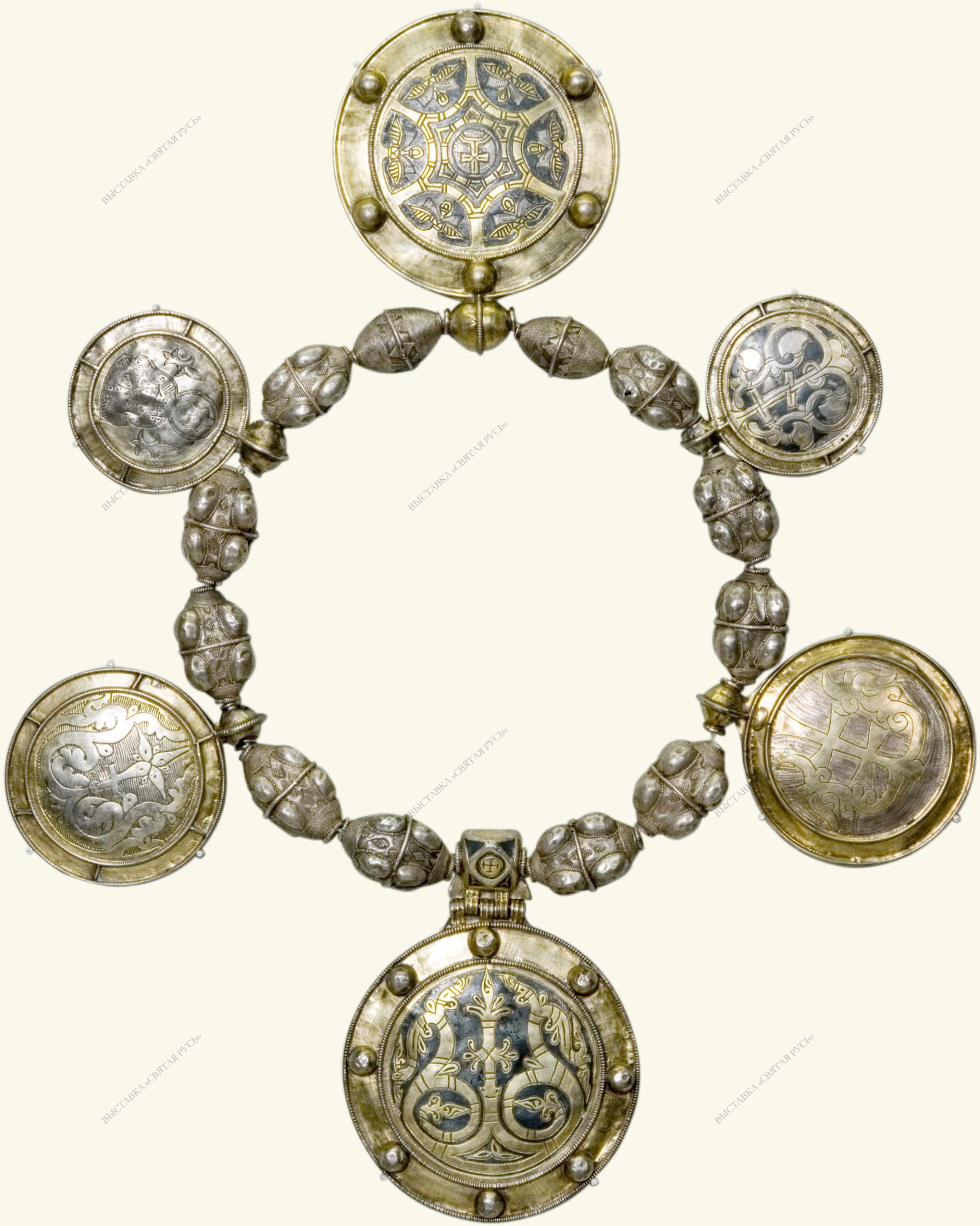 Медальоны: серебро; штамповка, резьба, золочение, чернь Бусы: серебро; штамповка, скань, чернь, пайка Диаметр медальонов – 9,1; 7,2; 5,5; 8,7; 6,8; 5,6. Длина бусин: 3,7 (2 шт.); 3,6 (6 шт.); 3,2 (2 шт.); 3,0 (2 шт.) Поступило в 1863 году из Оружейной палаты Найдено в 1851 году во время раскопок А.С. Уваровым близ деревни Исады Владимирской области ГИМ инв. 54807, оп. 2190В/1, СБ 1374