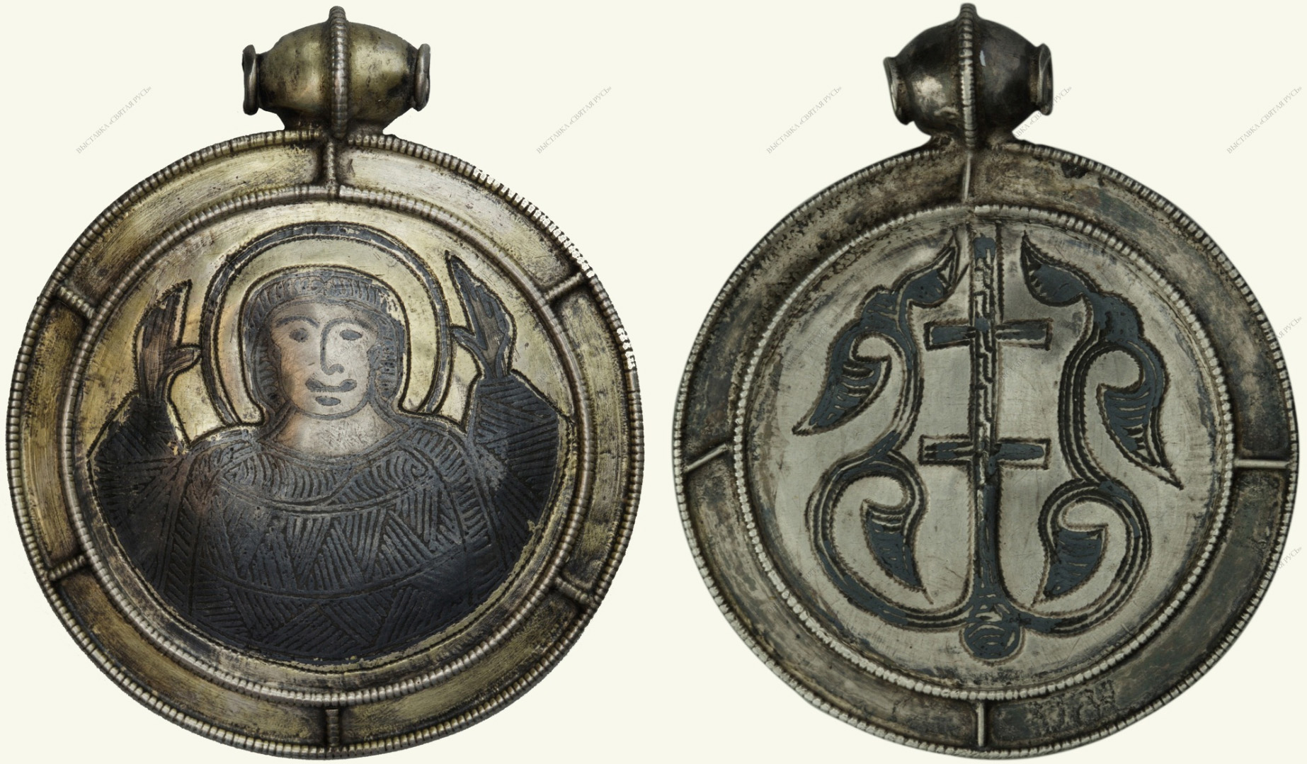 Серебро; литье, чернь Диаметр – 6; 5,2 Поступили в 1890 году Происходят из клада, найденного в 1837 году во Владимире, у Нижегородской заставы ГИМ инв. 78605, оп. 1088В/1; 78605, оп. 1088В/3