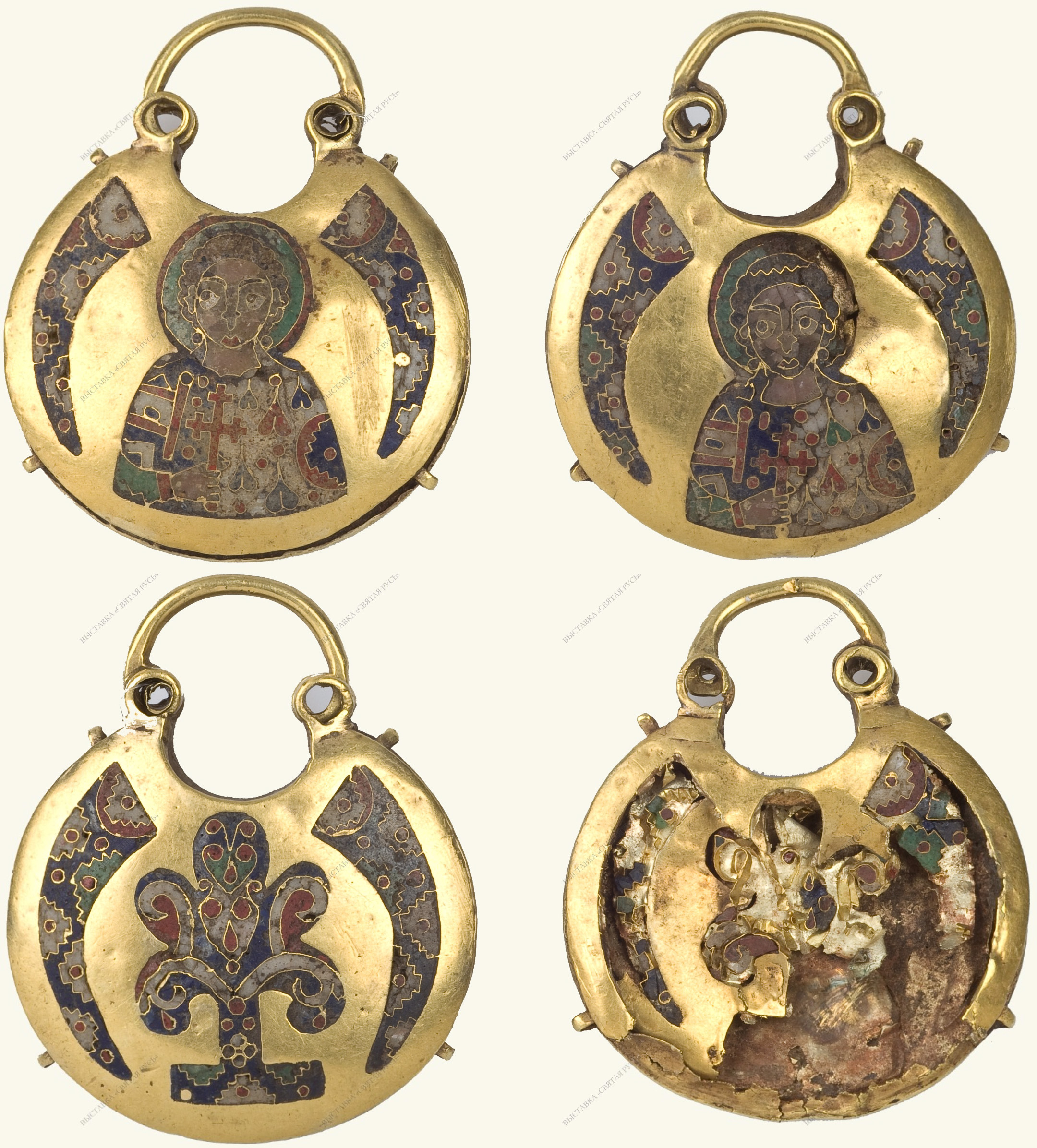 Киев Золото; перегородчатая эмаль 4,4 x 3,6 x 1,2; 4,4 x 3,6 x 0,5 Поступили в 1888 году из Императорской Археологической комиссии Происходят из клада, найденного в 1887 году в Чернигове, в районе Александровской площади ГЭ инв. 1021/9; 1021/10