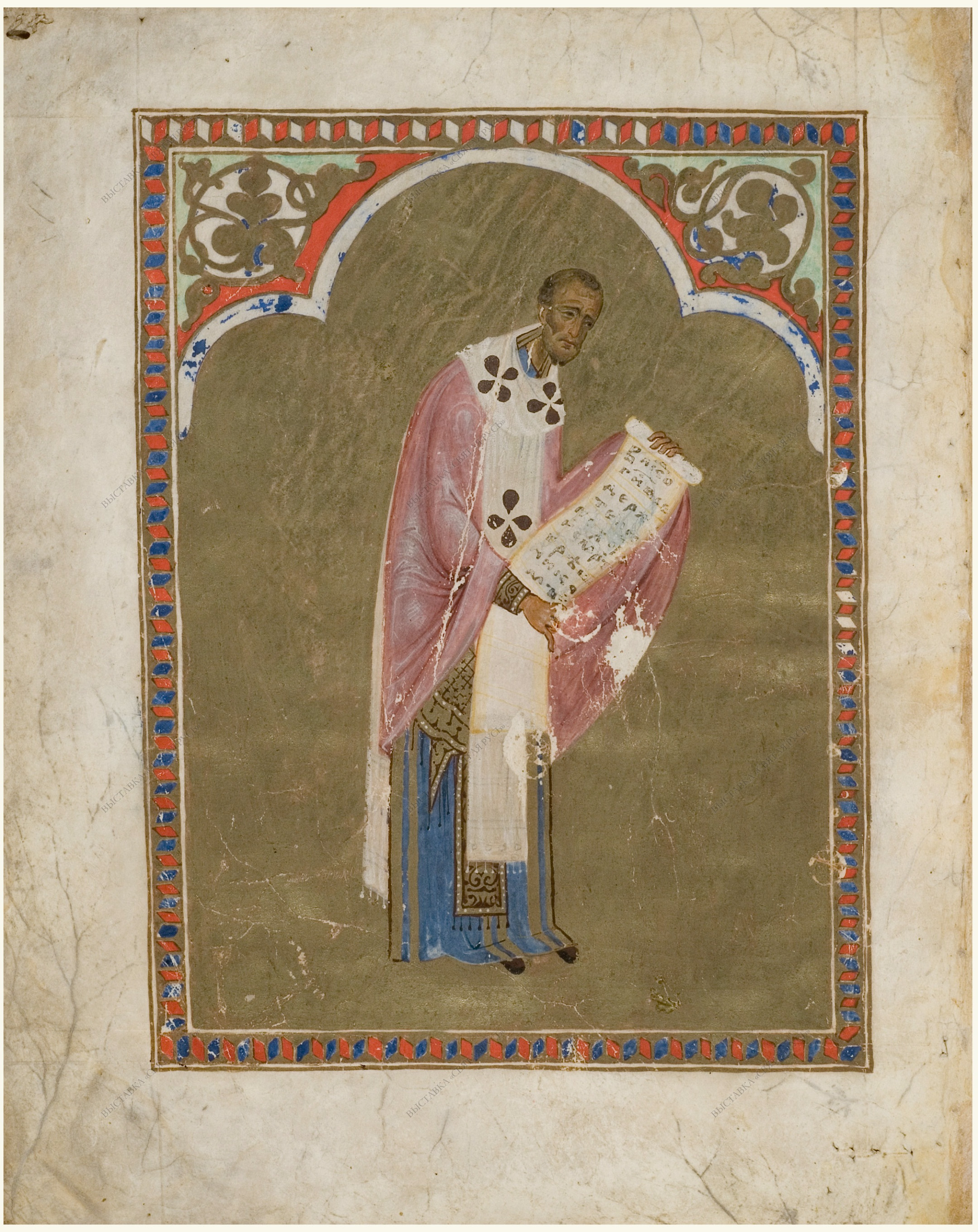 20 л. Пергамент; чернила, киноварь, темпера, твореное золото; переплет – картон, кожа 25 x 20 x 1,8 Поступил в 1920 году в составе Синодальной патриаршей библиотеки На л. 13 запись XVII века: Служебник великого чудотворца Варлаама ево собинной прислал ему из Царяграда Никифор патриарх Происходит из Хутынского монастыря в Великом Новгороде Реставрирован в 1995 году в ВХНРЦ им. И.Э. Грабаря Г.З. Быковой ГИМ инв. 80370, ОР Син. 604