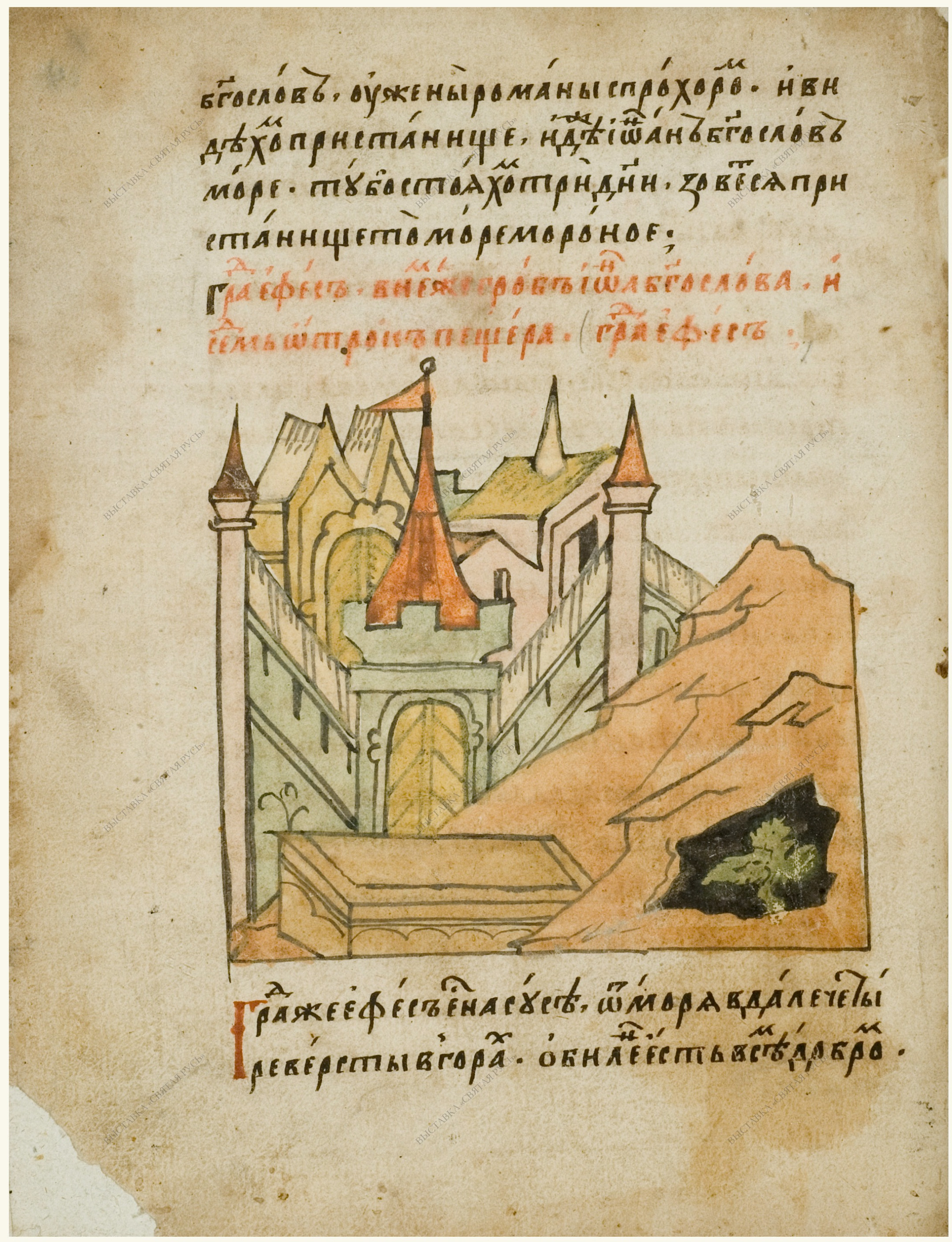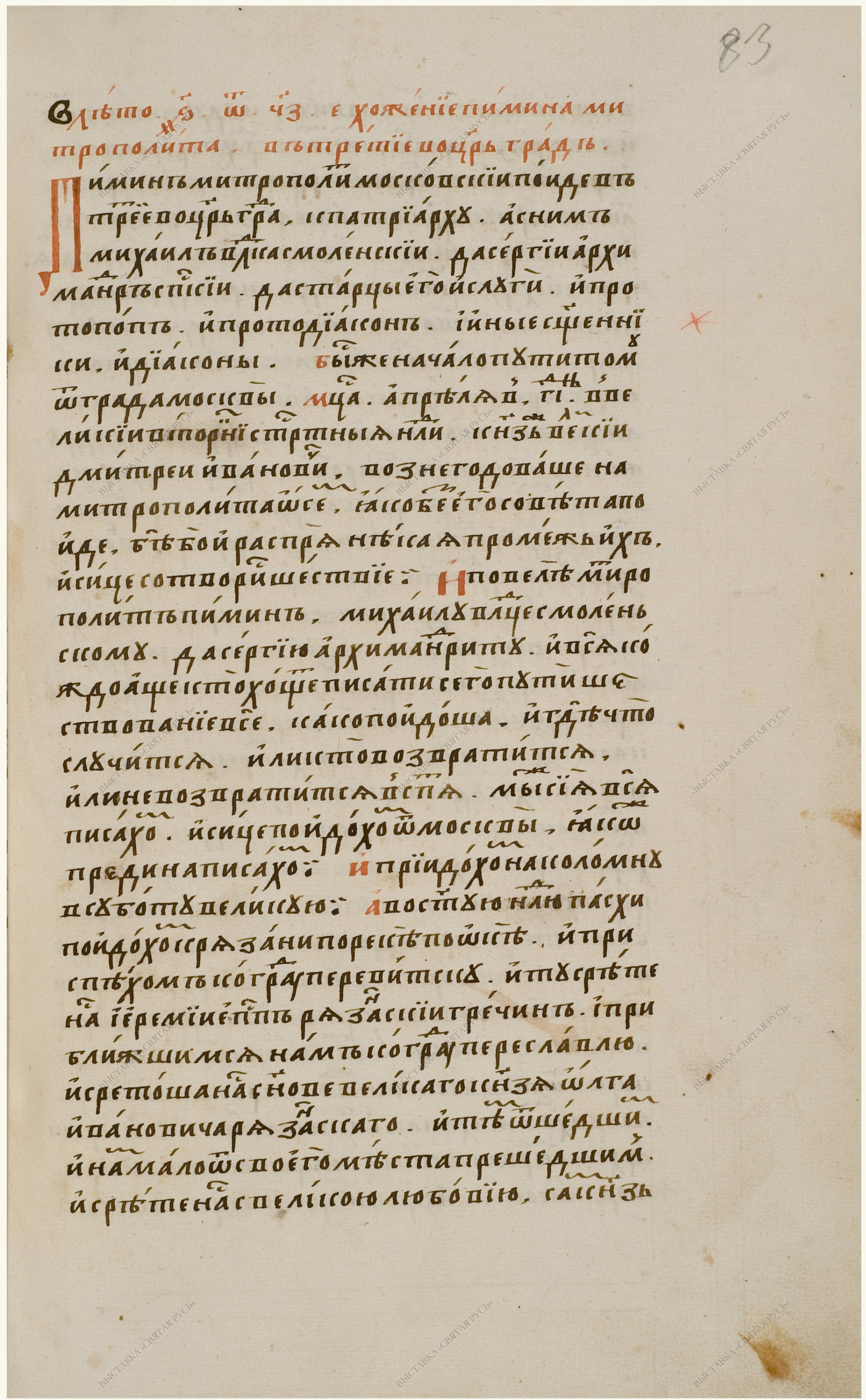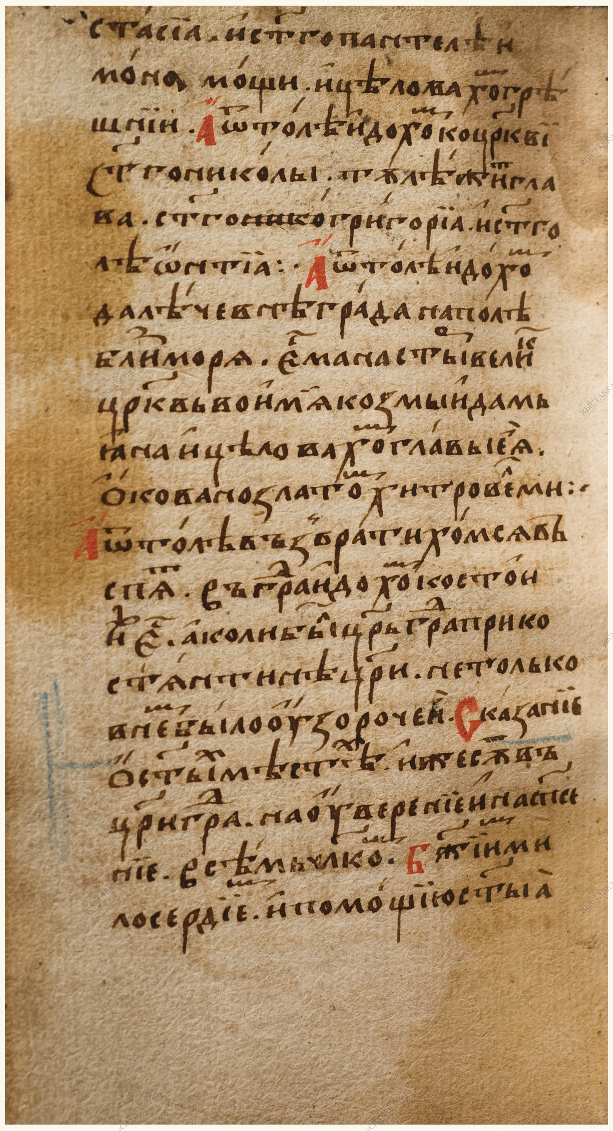 Кострома Бумага; чернила, киноварь; переплет – картон, кожа 33,2 x 22 x 5,5 Поступил в 1887 году в составе собрания А.Д. Черткова Происходит из Богоявленского монастыря в Костроме ГИМ инв. 80497, ОР Черт. 115(Б)
