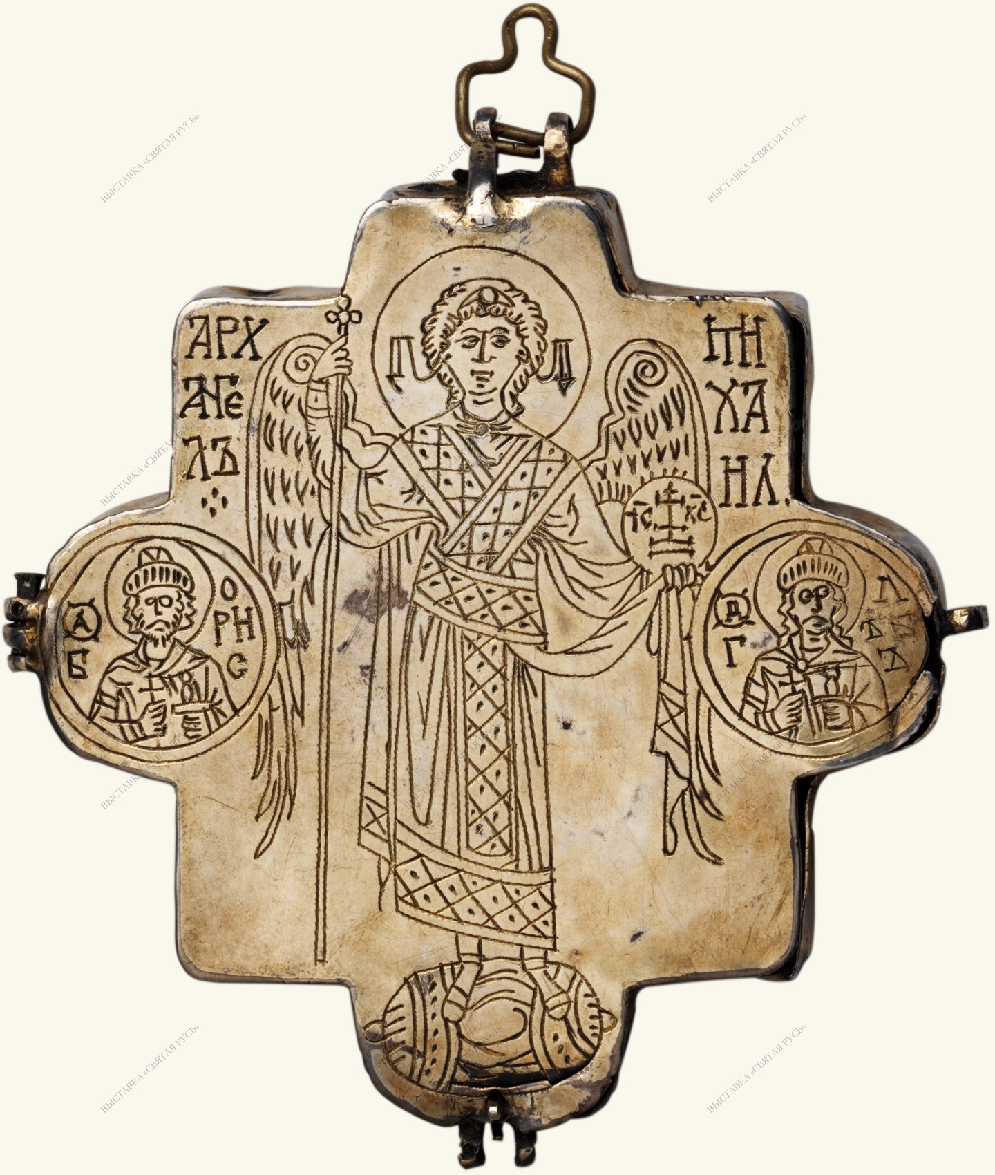 Первая половина XIII века – внутренний ковчежец. Первая четверть XIV века – внешний ковчег Тверь (?) – внутренний ковчежец Серебро; чеканка, резьба, золочение 6,6 ? 6,2 (внутренний ковчежец); 11 ? 10,4 (внешний ковчег) Поступил в 1920 году Происходит из Благовещенского собора Московского Кремля ММК инв. МР-3318/1–2