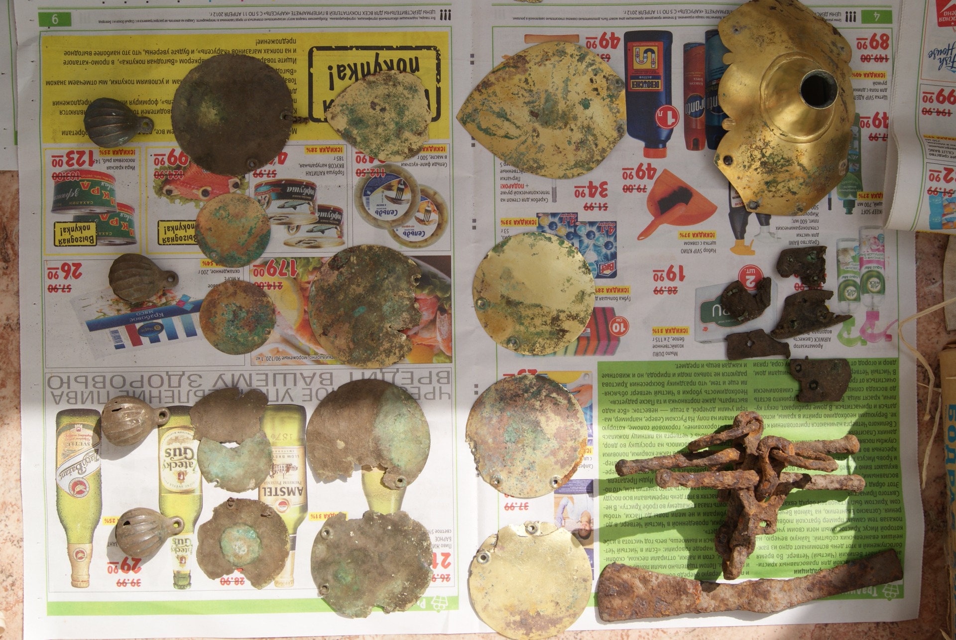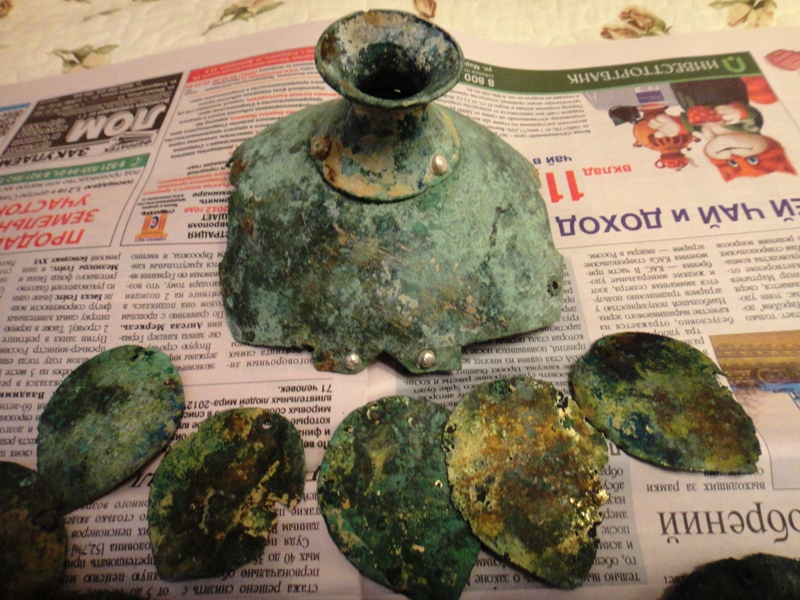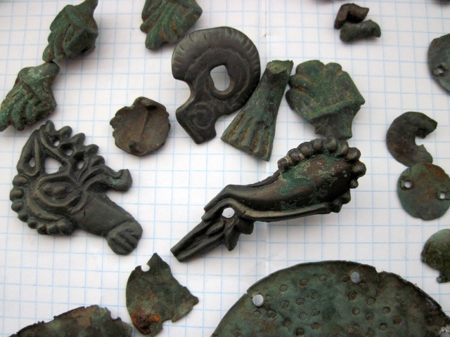 Среди найденных металлических предметов конской упряжи Х-ХII вв. имеются сугубо декоративные элементы – начельники (3 экз), большие плоские сбруйные бляхи (3 экз.) и решмы (5 экз.). Под начельниками мы подразумеваем крупные металлические пластины с трубкой-втулкой для султана, которые крепились к затылочному и налобному ремням оголовья. Сами султаны делались из органических материалов, конского волоса, перьев или нитей и практически не сохраняются. Под решмамн имеются в виду только подвесные бляхи сбруйных, в том числе уздечных ремней, что соответствует словарному толкованию этого термина. Комплексное исследование перечисленных украшении отражено в данной статье и статье Л.В. Коньковой, посвященной технико-технологическому их изучению.