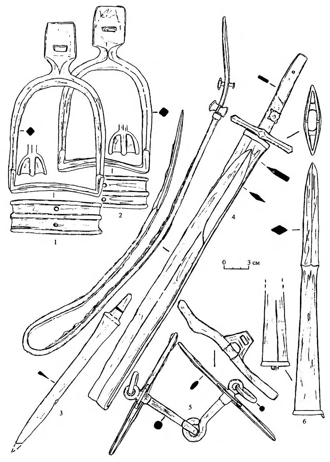 Fig. 1. Complex № 1: 1, 2 — stirrups; 3 — a knife; 4 — а sabre; 5 — а horse-bit; 6 — а lance-head. 1-6 — iron.