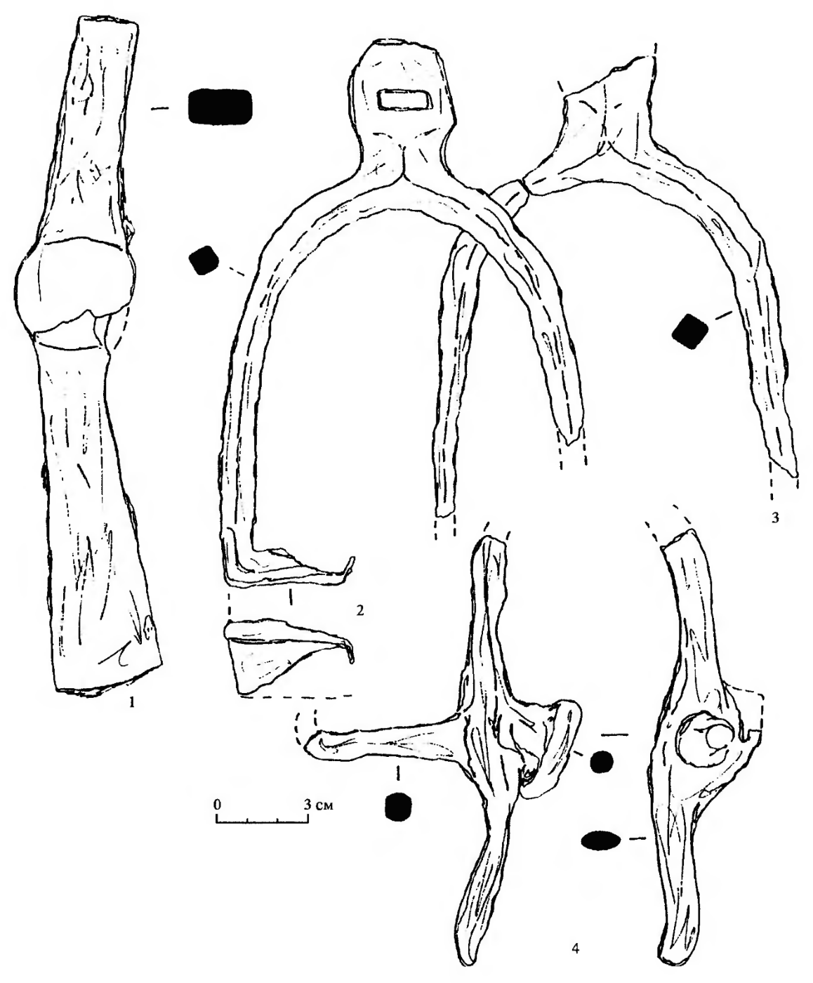 Fig. 2. Complex №2: 1-а hatchet-stamp; 2, 3 - stirrups; 4 - а horse-bit. 1-4 - iron.