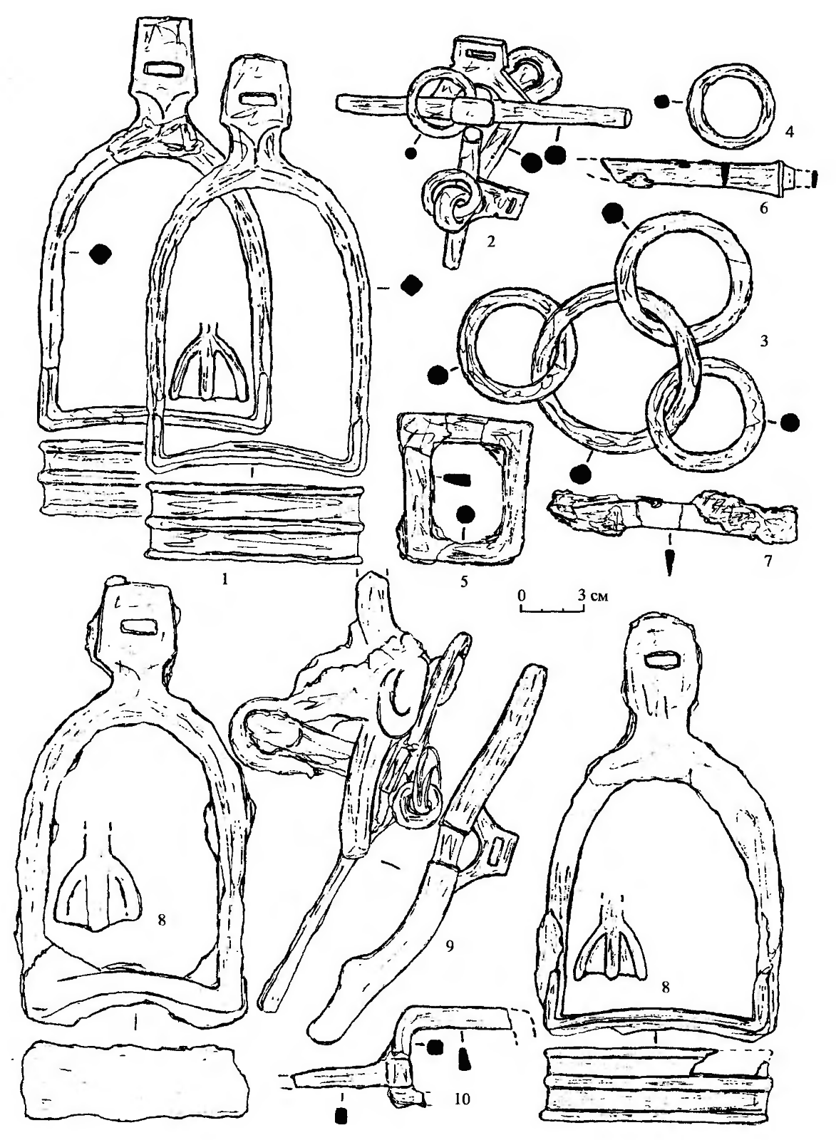 Стремена (рис.1, 1, 2; 2, 2, 3; 3, 1, 8), обнаруженные в комплексах, относятся к типу, наиболее характерному для памятников 2-й пол. VIII 1-й пол.Х в. (ПлетневаС.А., 1967, с. 167). Они встречаются как в памятниках аланского, так и болгарского населения Подонцовья (Криганов А.В., 1993, рис.1, 17; Пархоменко О.В., 1983, рис. 5, 1; Татаринов С. И., Копыл А.Г., Шамрай А.В., 1986, рис. 3, 14). Обнаружены они в биритуальных и кремационных могильниках бассейна Северского Донца (Аксенов В.С., Крыганов А.В., Михеев В.К., 1996, рис. 4, 1-7; Шрамко Б.А., 1983, рис.11,12; Кухаренко Ю.В., 1951, рис.3 2,1-4; 34; 36; Крыганов А.В., 1989, рис.4, 1-4).