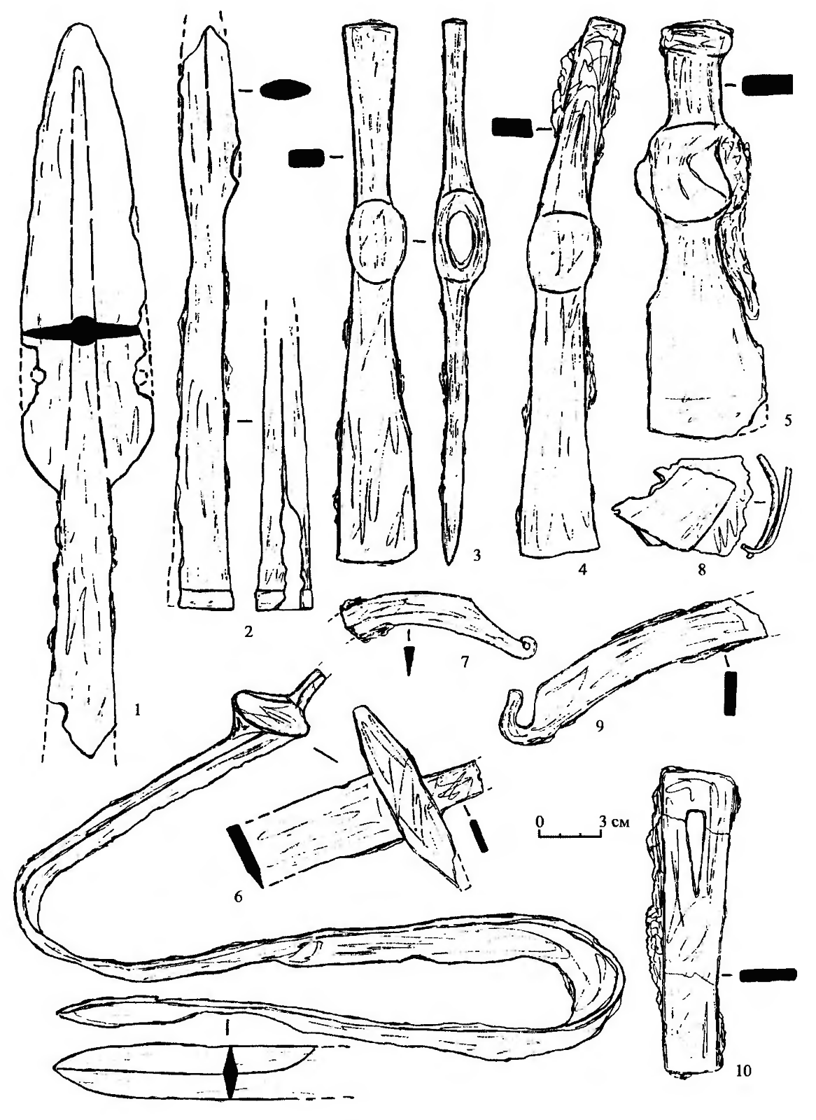Fig. 4. Complex № 3:1, 2 — spear-heads; 3,4,5 — hatchets-stamps; 6 — а sabre; 7 — a folding sickle; 8 — plates of the caldron; 9 — а fragment of the caldron arcuate handle; 10 — a loop of the caldron. 1-10 — iron.