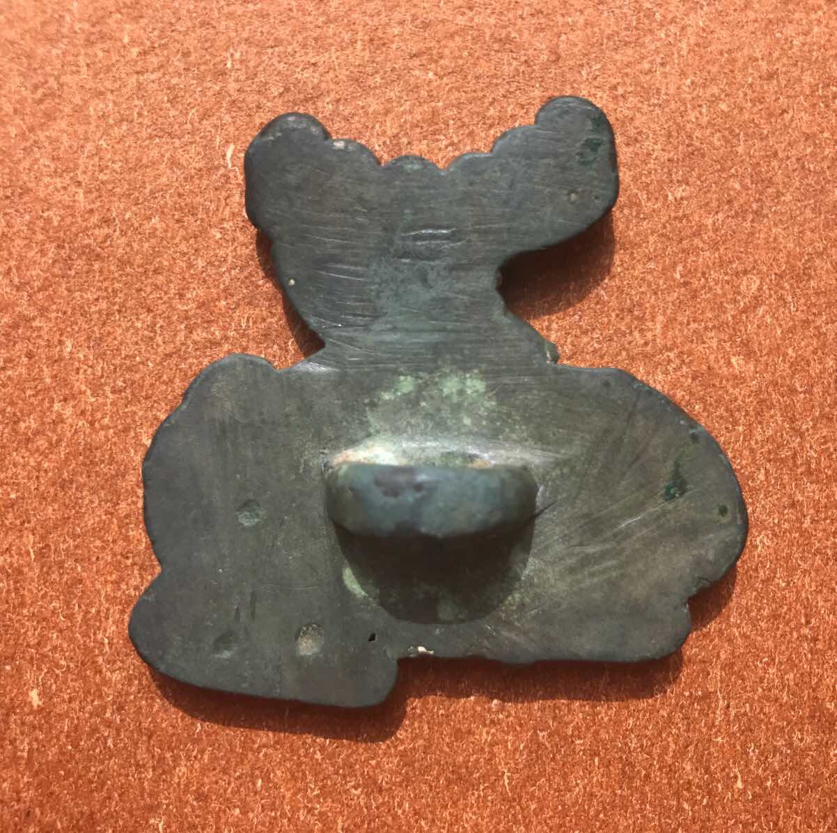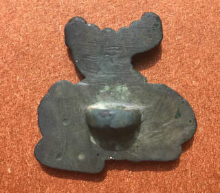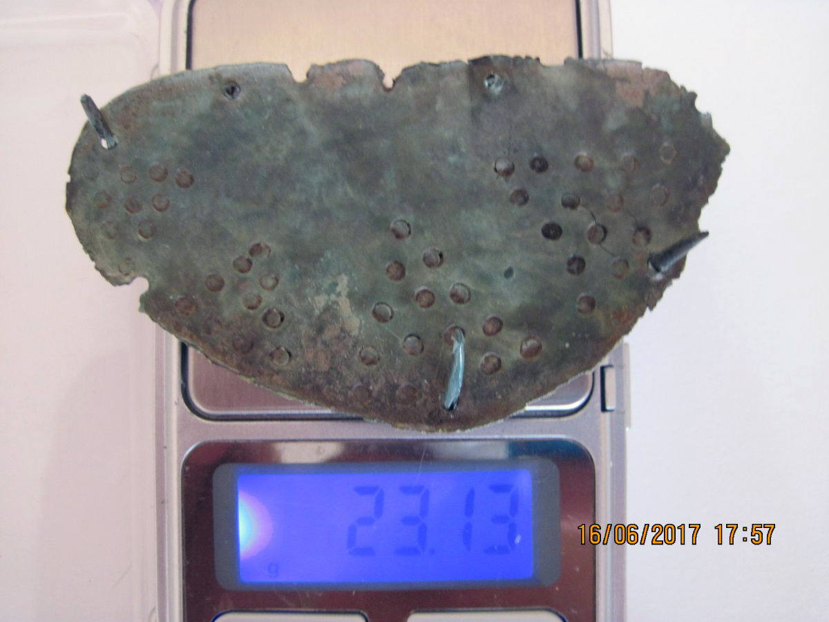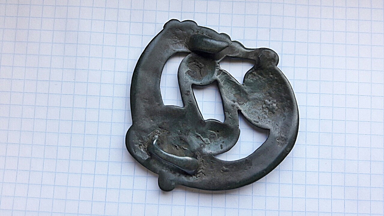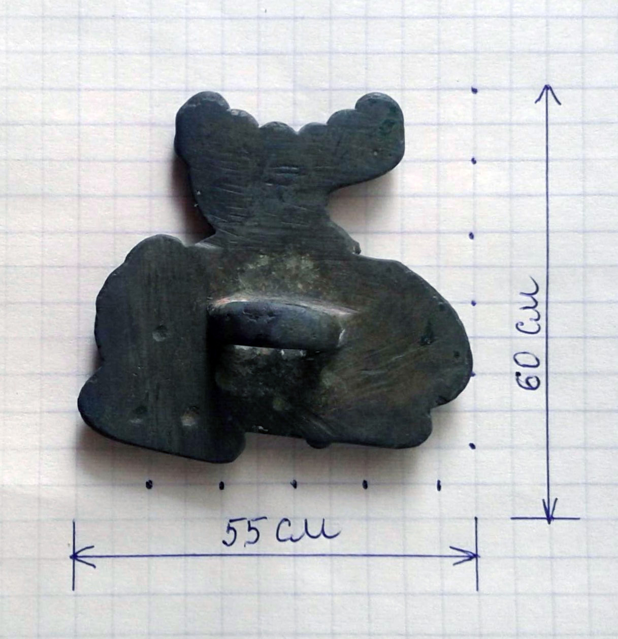 Данная бляшка была представлена Виолити, кладоискателем OlehKzm. Размер: около 7 сантиметров и вес: 62 грамма видно на фото. Вторая петля с тыльной стороны поломана. Сюжет с хищником из семества кошачих распространен в скифском зверином стиле. Намного более интересно обсуждение происхождения предмета.