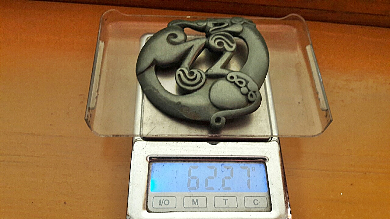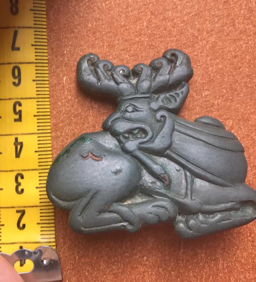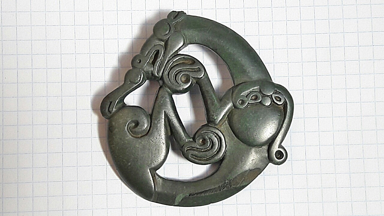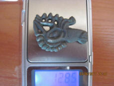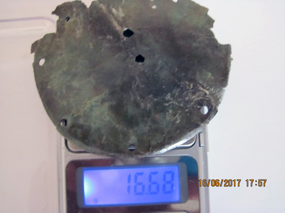 Данная бляшка была представлена Виолити, кладоискателем OlehKzm. Размер: около 7 сантиметров и вес: 62 грамма видно на фото. Вторая петля с тыльной стороны поломана. Сюжет с хищником из семества кошачих распространен в скифском зверином стиле. Намного более интересно обсуждение происхождения предмета.