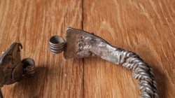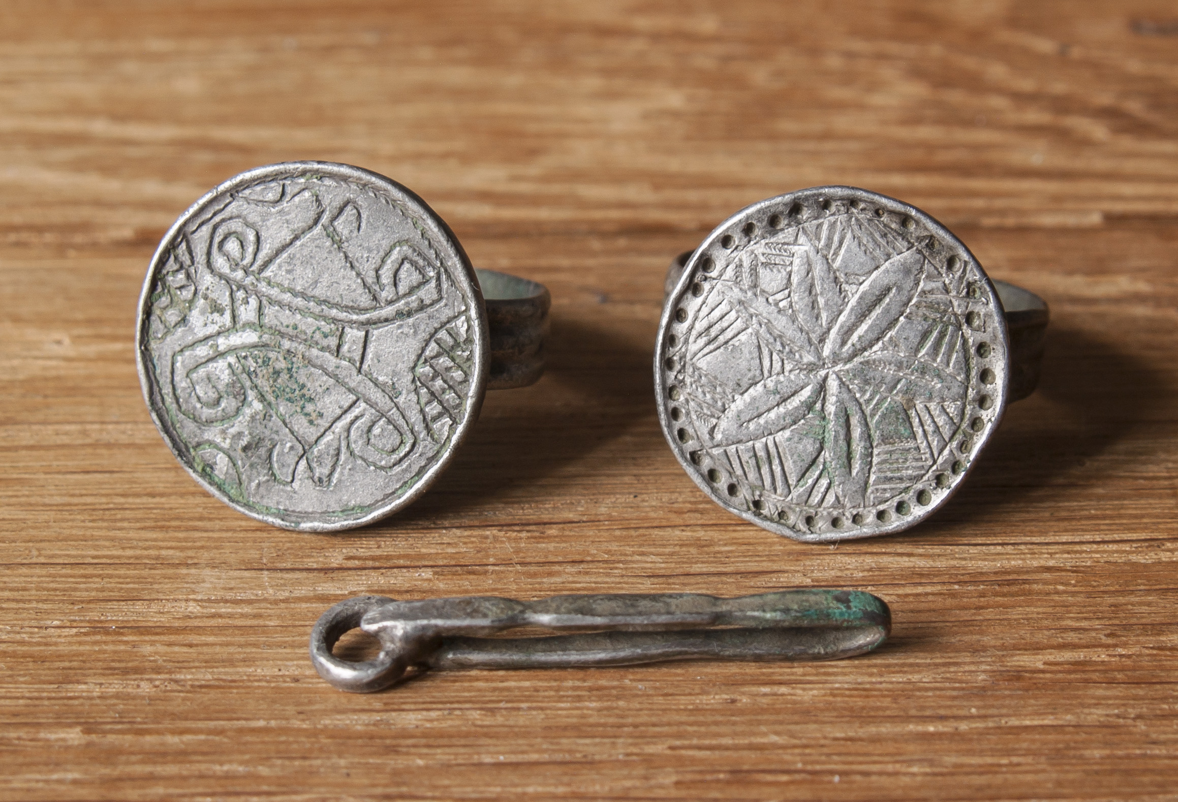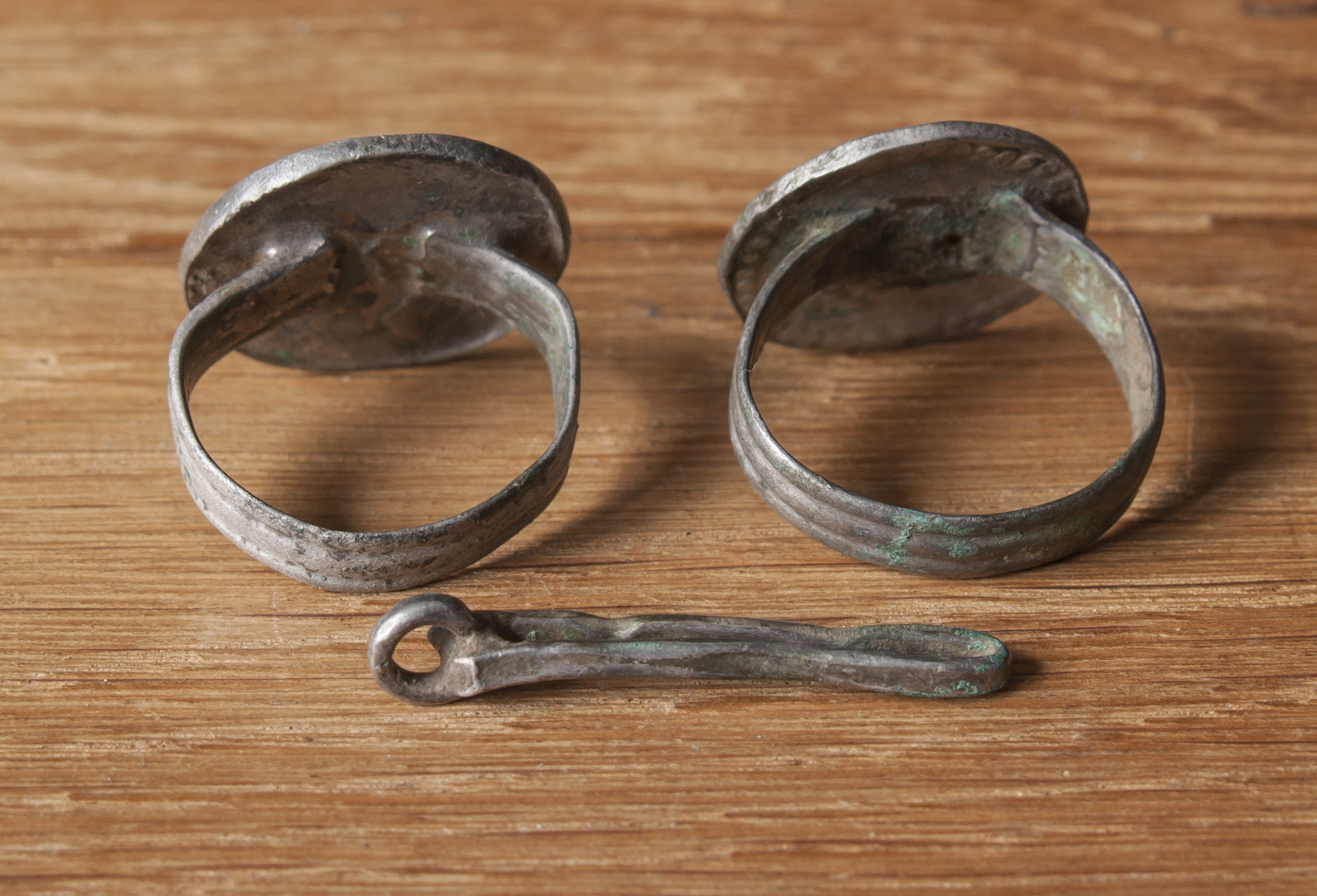 Оба перстня выполнены в схожей технике. Они представляють собой монетовидный щиток к которому припаяна относительно тонка дужка, не сомкнутая в кольцо. На одном тамгообразный знак, который можно интерпретировать как проросшее зерно, на другом – цветочная розетка. Перстни относятся к Галицко-Волынскому типу, который датируется от начала XIV до середины XV века.