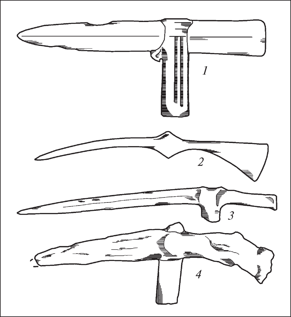 II.1 – клевец с лопастью на тыльной стороне представлен только экземпляром с Трахтемировского городища. Исключительность находки обусловлена привнесенным ее характером. Прямой аналогией трахтемировскому клевцу является изделие из кургана Цукур Лиман (Вахтина 1989, с. 52). В целом же подобная форма тяготеет к культурам Западной Сибири (Ильинская 1961, с. 36).