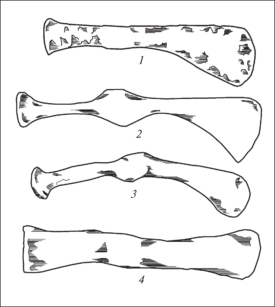 Первый отдел – клиновидные топоры – в свое время разделяли на два типа: топоры с прямой лобовой частью и с выемкой у основания. Но, несмотря на указанные нами требования, считаем, что целесообразнее рассматривать как боевые исключительно топоры второго типа. Итак, сюда попадают 4 экз.: с кургана 9 у с. Куцеволовка, кургана у с. Луга и два топора со Старшей Могилы (см. Приложение, там и ссылка).
