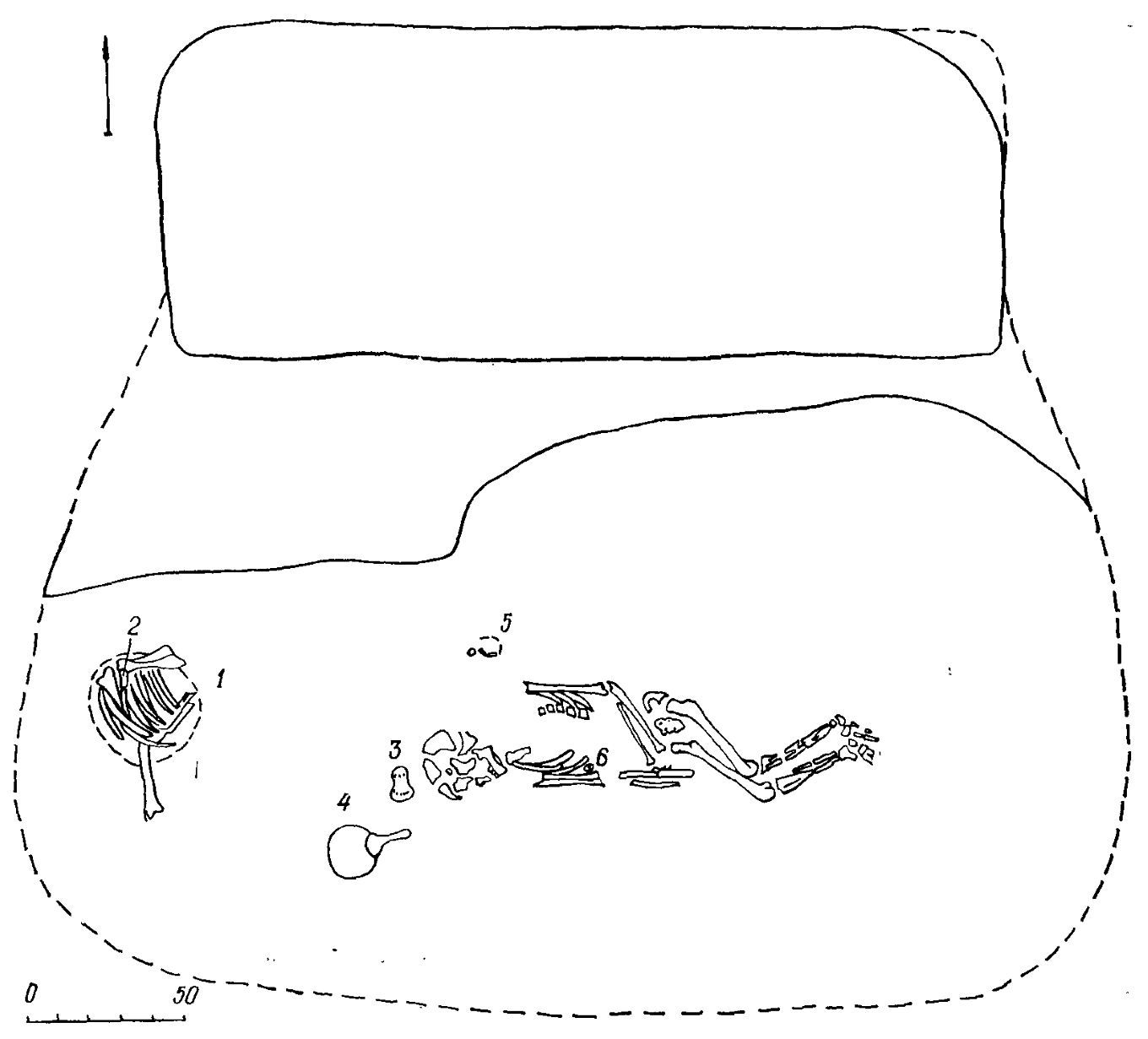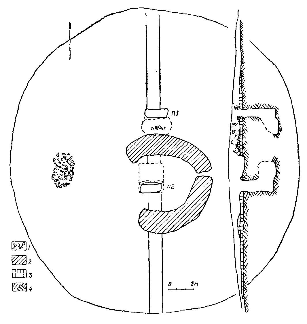 Погребение № 1 (основное, мужское) находилось в центре кургана (рис. 4-6). Совершено в яме с подбоем. Прямоугольная входная яма размерами 2,6 x 1,3 м ориентирована по липни восток — запад. Торцевые стенки ямы подбиваются ко дну. Дно ямы — на глубине 5,2 м от уровня древнего горизонта. Входную яму погребения полукольцом диаметром около 10 м окружал вал материкового выкида шириной 1,8-2, мощностью 0,3-0,8 м. Полукольцо имело разрывы: па западе — шириной 6 и на востоке — 0,3 м. Погребение было ограблено в древности с вершины кургана через вертикальную воронку, попавшую во входную яму. В затечном черноземном заполнении входной ямы найдены антропоморфная стела (I), вероятно, ранее стоявшая на вершине кургана, плита постамент (2), кости человека, животных, наконечник стрелы (3), обломки ножа (4).