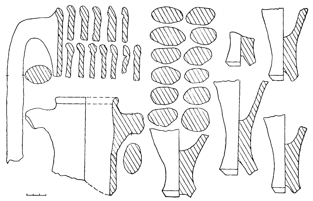10. Булава состояла из свинцового шаровидного навершия с коническим отверстием, расширяющимся книзу, и бронзовой оковки основания рукояти в виде литого диска с отверстием в центре, уплощенного с нижней стороны и невысоким бортиком с верхней. Размеры навершия: диаметр 5, диаметры отверстия 1.8 и 2.5 см. Размеры оковки: диаметр диска 2,8, отверстия 0,6, высота бортика 0,4 см (рис. 13, 7, 2).