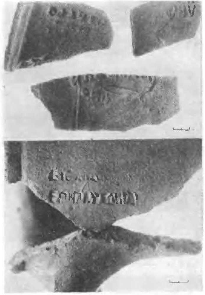 Курган № 2* высотой 1,25 и диаметром около 35 м занимал центральное положение в группе. В нем находились два скифских захоронения. Курган был насыпан в один прием над основным мужским погребением № 1. Женское погребение № 2 впущено в готовую насыпь без каких-либо досыпок. Между входными ямами захоронений находилась овальная в плане яма размерами 3.2 x 2,3 м, выкопанная с уровня древнего горизонта; углублена в материк на 0,2 м. Происхождение ее выяснить не удалось. В западной части кургана на уровне древнего горизонта обнаружены остатки тризны в виде скопления фрагментов амфор и костей животных, связанной с основным погребением № 1, Площадь скопления 4 x 3 м (рис. 1). Здесь собраны фрагменты 14 амфор, в основном гераклейского производства, и отдельные фрагменты хиосской колпачковой амфоры (рис. 2). Четыре гераклейские амфоры имели на горловинах энглифическиеее клейма (рис. 3):