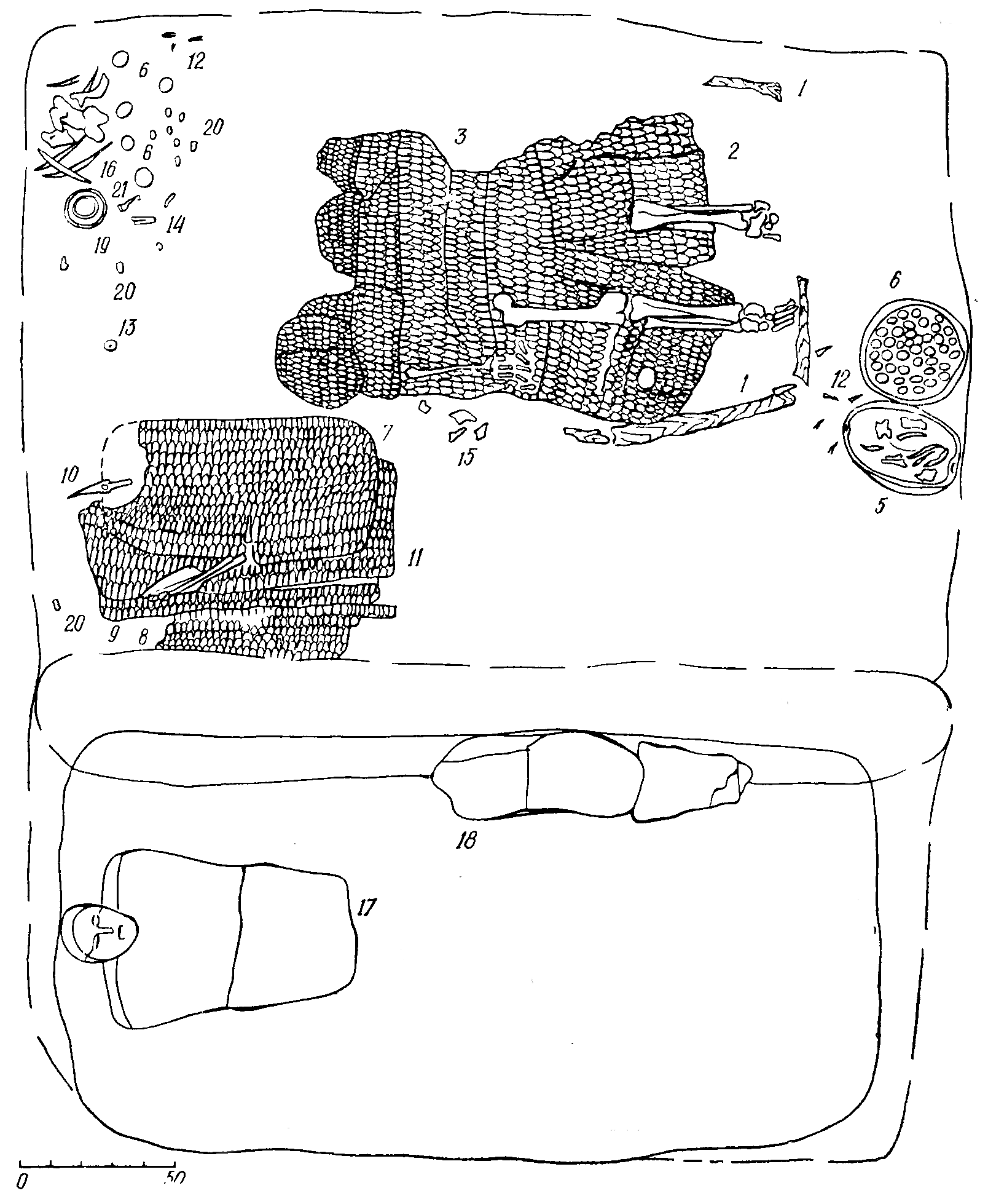 Вход в камеру, находившийся в северной стенке (высота свода 1 м), закрывала камышовая циновка, остатки которой были обнаружены на дне входной ямы. В камеру (дно на глубине 5,4 м) вела невысокая ступенька. Большая часть погребального инвентаря, не представлявшего интерес для грабителей, сохранилась в почти непотревоженном состоянии. Под северной степной камеры на панцире (5), разостланном на деревянном настиле и скрепленном железными скобами (9), лежал вытяпуто на спине головой па запад скелет погребенного. Его сопровождали следующие предметы: детали булавы (10), щит (6), дополнительный набор защитного доспеха (7), наконечники копья (11) и дротика (12), топор (13), кости напутственной пищи (лошадь или бык), бронзовый котел с костями овцы (14), деревянная чаша с праще-выми камнями (15). За головой погребенного был устроен тайник в виде цилиндрического углубления в полу камеры глубиной 0,3 м. В нем найден серебряный сосуд (16). Кроме того, в заполнении камеры обнаружены 15 золотых нашивных бляшек (17), фрагменты клинка меча ,ворварка (18), большое количество обломков панциря (8), рукоять ножа (4), костяные изделия (19), наконечники стрел (3), фрагменты сероглиняной ойнохои (20), четыре втока копий (21).