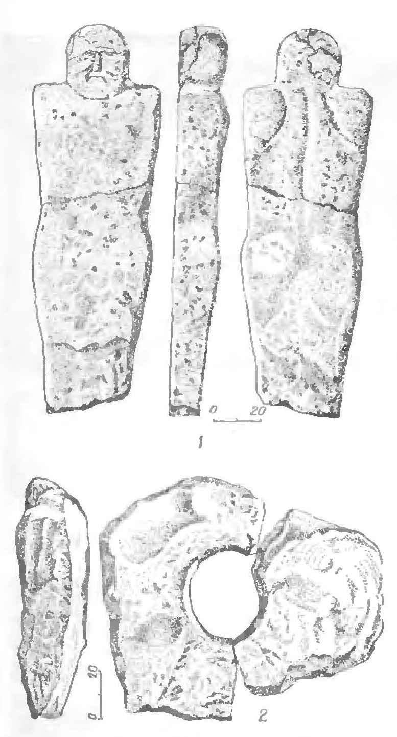 1. Стела изготовлена из плотной известняковой плиты. Круглая голова утоплена в плечи. Па плоском лице выделены детали: глаза, прямой нос, рот с низко опущенными уголками. Плечи прямые, угловатые. На корпусе с лицевой стороны изображения отсутствуют. Сужениями с боков выделены талия и бедра. Нижняя часть стелы заострена. На спине рельефом показали лопатки, позвоночник и ягодицы. Высота стелы 1,4, ширина в плечах 0,5, нижнего края 0,3, толщина плиты 0,2-0,25 м (рис. 7, 7).