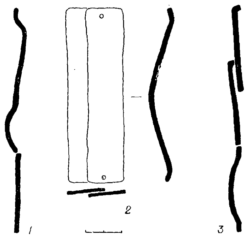 13. Железный проушпой изогнутый топор-молоток. Лезвие в отличие от других топоров узкое. В расширяющейся средней части — круглый проух. Обушок легкий, удлиненный, квадратный в сечении. Длина топора 20, лезвийной части 8, обушка 8,6 см. Ширина лезвия 1,6, диаметр проуха 1,5 см (рис. 13, 3).