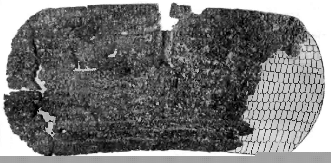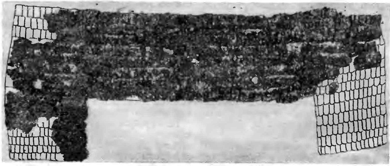 7. Дополнительный набор защитного вооружения состоял из набедренника, двух защитных поясов и доспеха неизвестного назначения. Набедренник имел форму буквы П с длинной перекладиной. Размеры 109 x 50 см. Верхняя часть набрана из восьми рядов прямоугольных пластин размерами 4X2 см. Прямоугольные выступы по краям размерами 24x26 см, набраны из семи рядов прямоугольных пластин размерами 3,3x2 см (рис. 11).