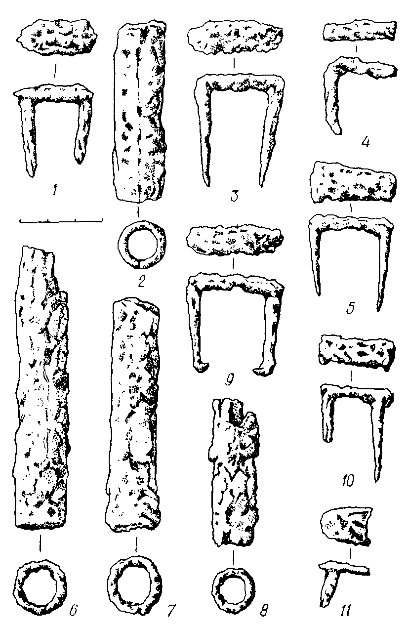 9. Деревянный дощатый настил сохранился частично. При разборке собраны железные П-образпые скобы, скрепляющие отдельные доски (рис. 12, 1,3 5,9-11).