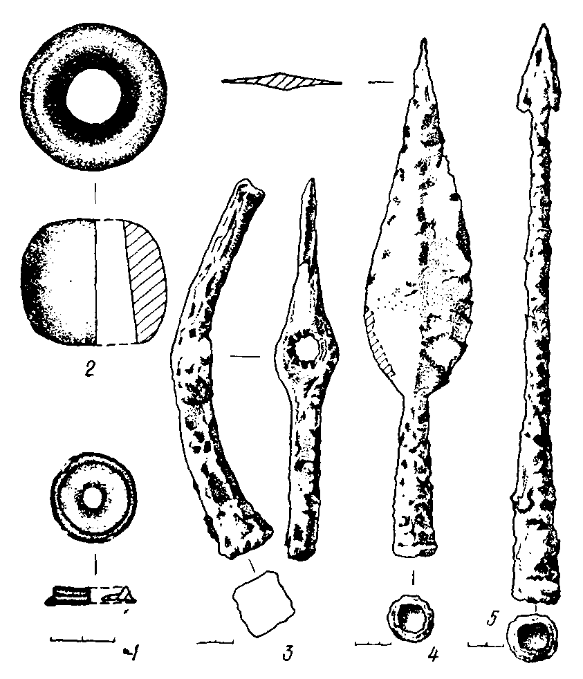 Погребенную сопровождали: напутственная пища (задняя часть лошади или быка) с ножом (1), лежавшая на истлевшем деревянном блюде, окованном по краю железной полоской; зеркало (2); фрагмент каифара (3); пряслице (4); железный предмет (5).