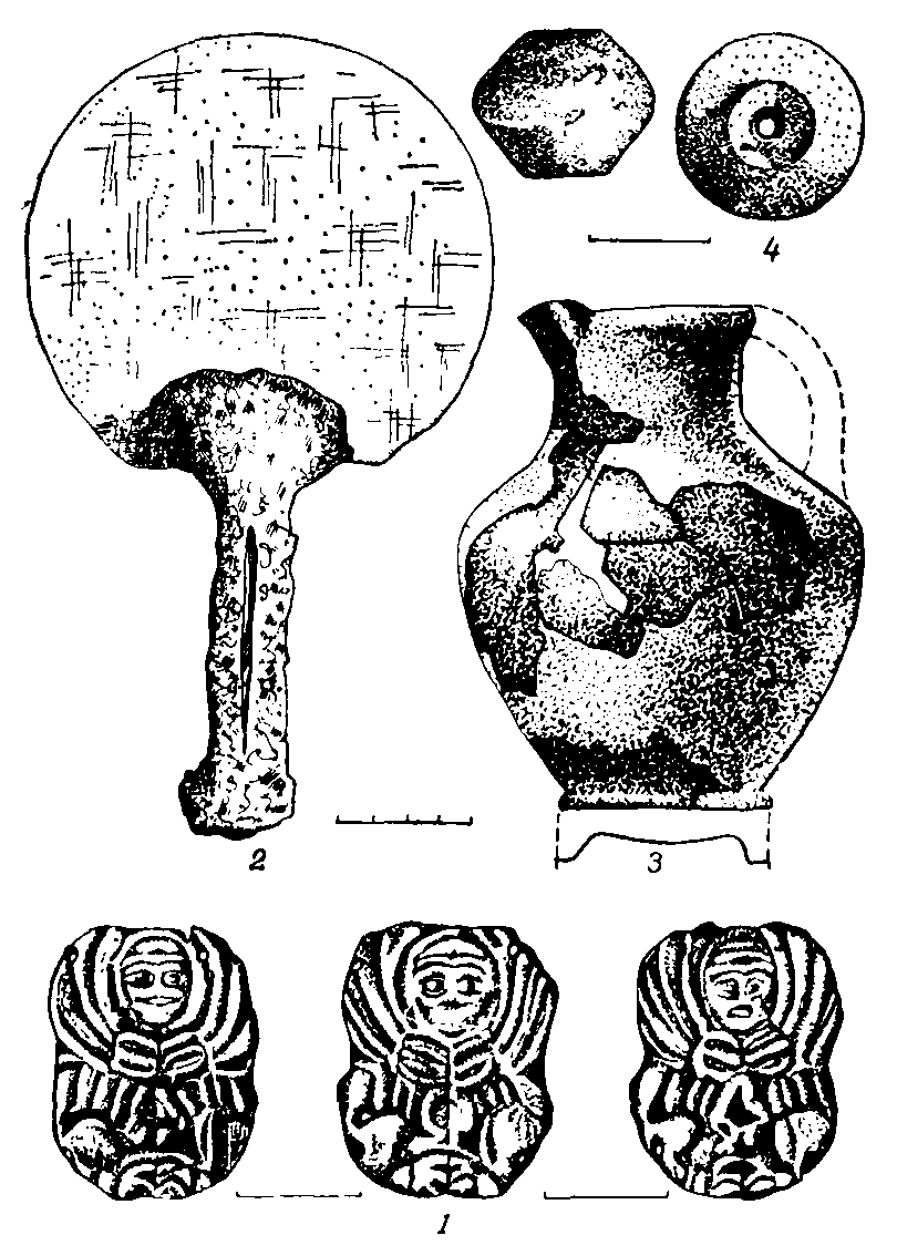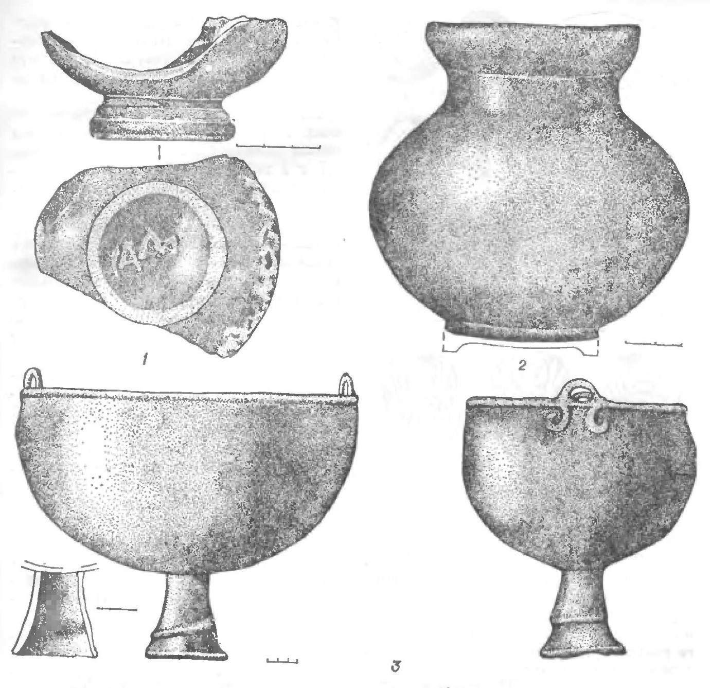 14. Бронзовый литой двуручный котел с овальным устьем. Венчик уплощен. Край его выступает наружу рельефным валиком. Ручки вертикальные, петлевидные. Под ручками на корпусе, как бы продолжая нх, рельефом выделены волютовидные отростки. Корпус котла укреплен на высокой конической полой ножке. Размеры котла: устье 35 ч 22 см, высота корпуса 19, ножки 9, диаметр основания ножки 9 см (рис. 14, 3).