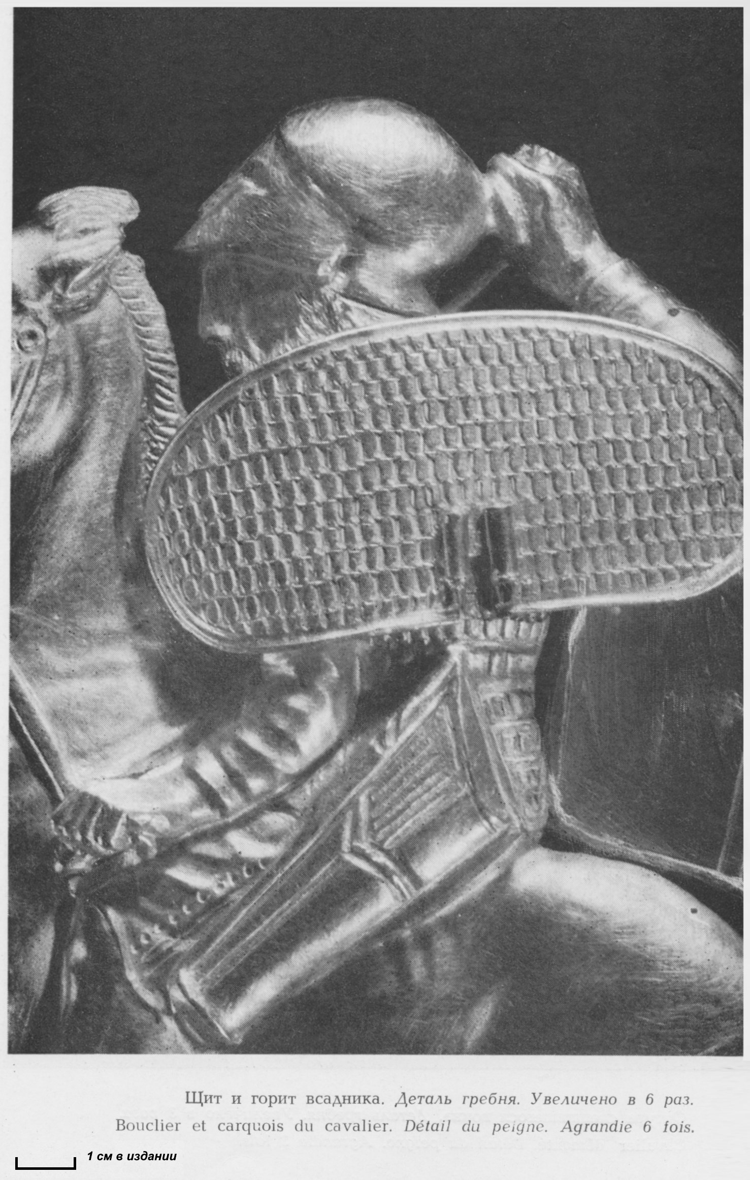 Остался невыясненным характер основы щита. Связь пластин в наборе щита нроизводнлась, скорее всего, с помощью ремней6, так как следы проволоки отсутствуют. Характер связи пластин, размеры н вес шита требовали использования твердой деревянной основы.